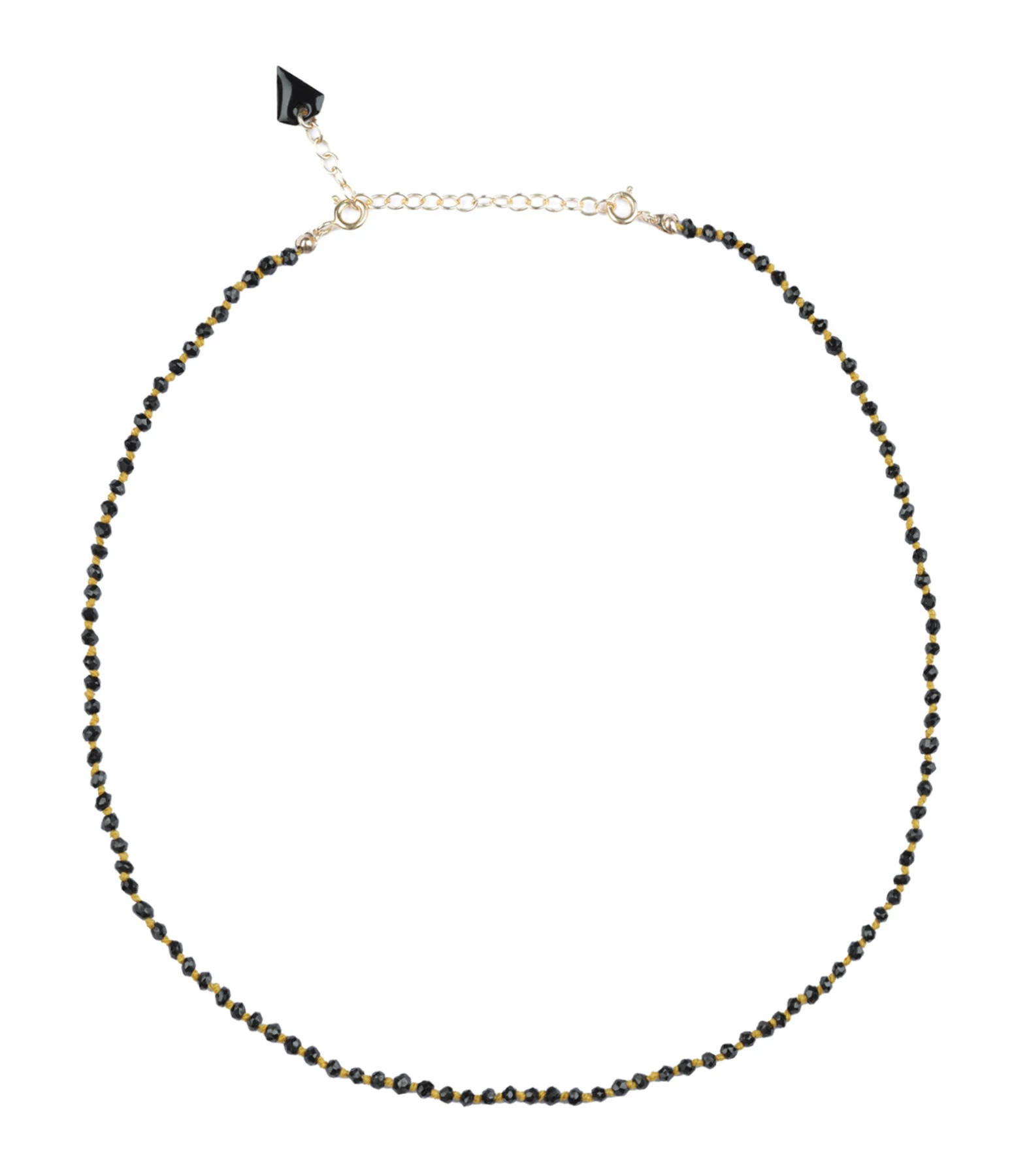 Collier en onyx sur cordon jaune. Fermoir à ressort en argent plaqué or avec chaînette de réglage.