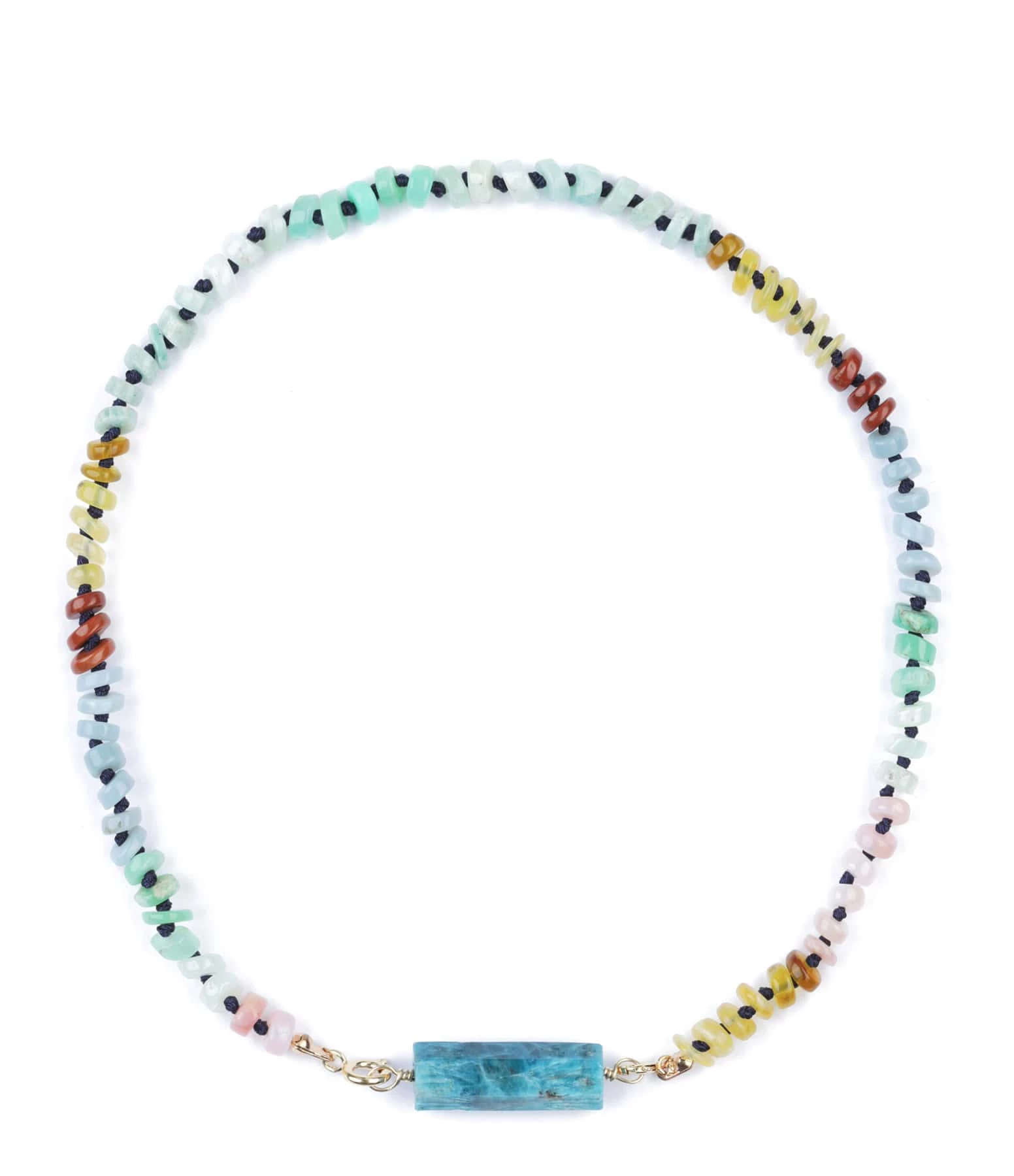 Collier en opale multicolore sur cordon noir. Fermoir à ressort en argent plaqué or avec chaînette de réglage et rolla bolla en apatite.