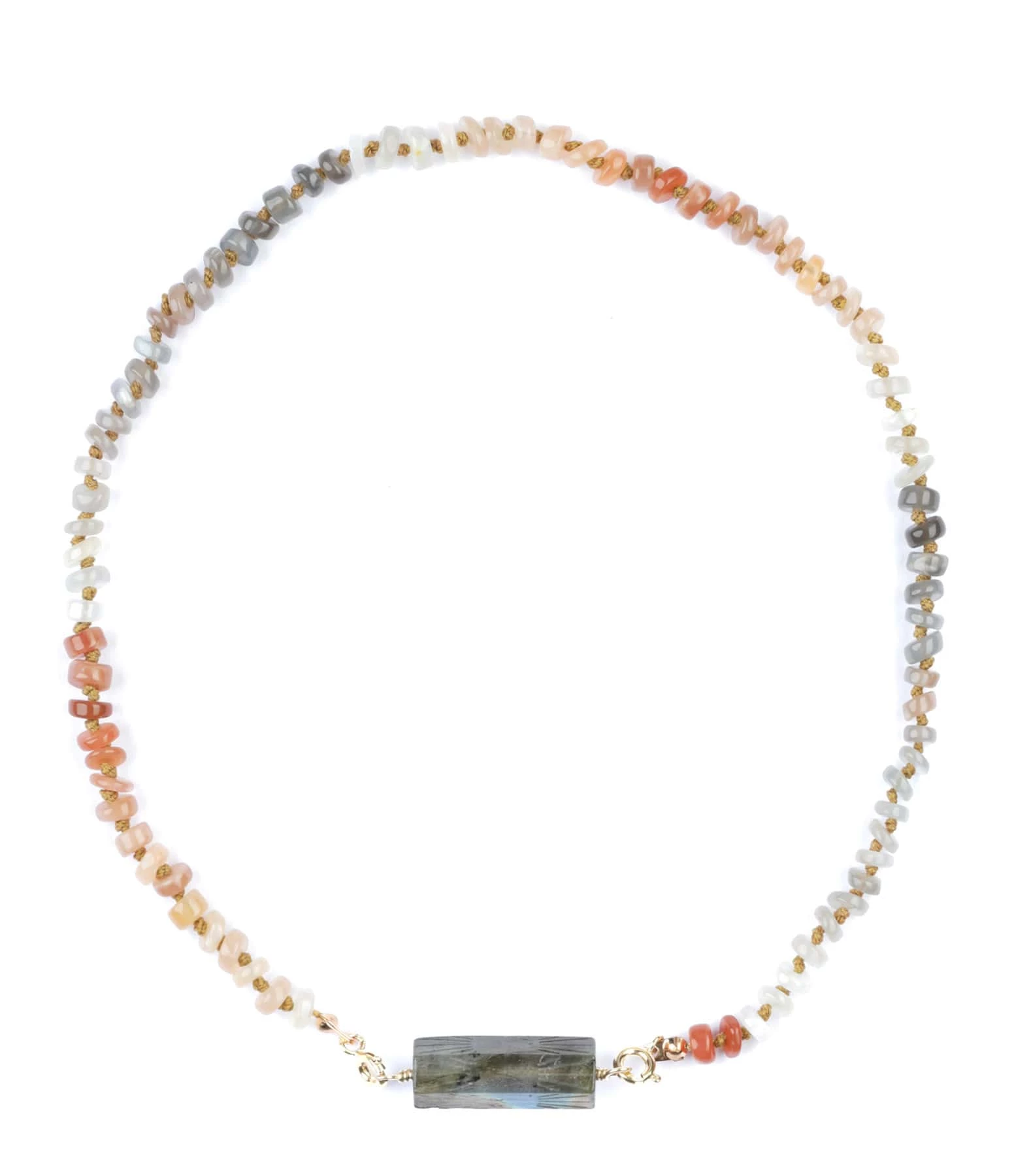 Collier en pierre de lune sur cordon jaune. Fermoir à ressort en argent plaqué or avec chaînette de réglage et rolla bolla en labradorite.