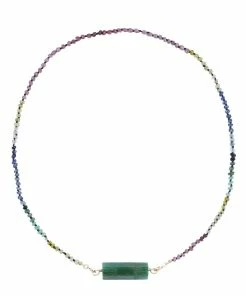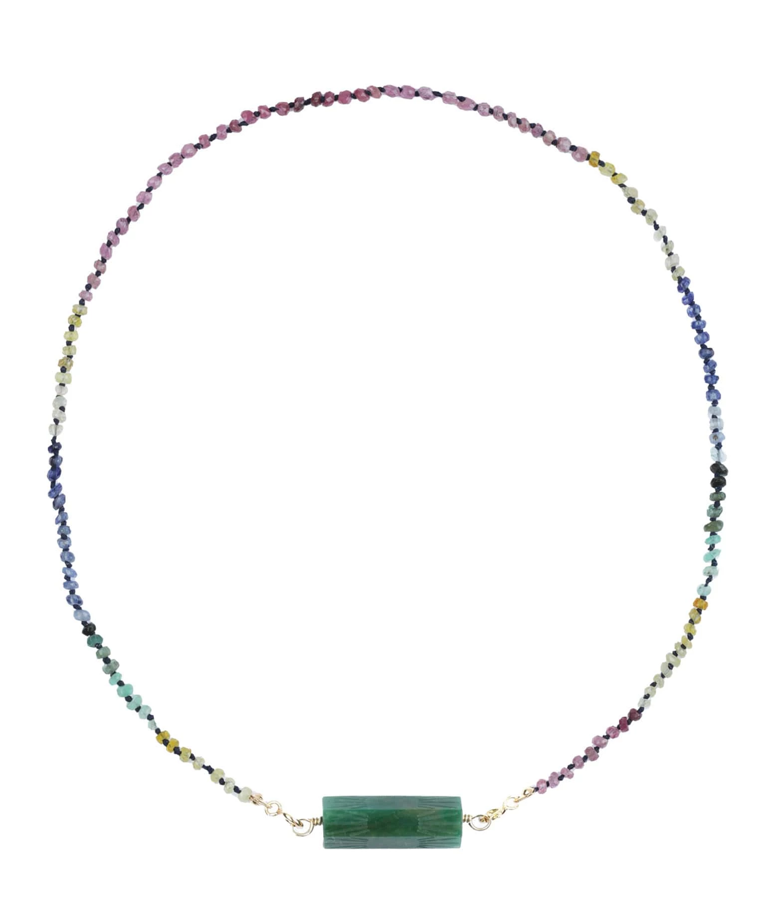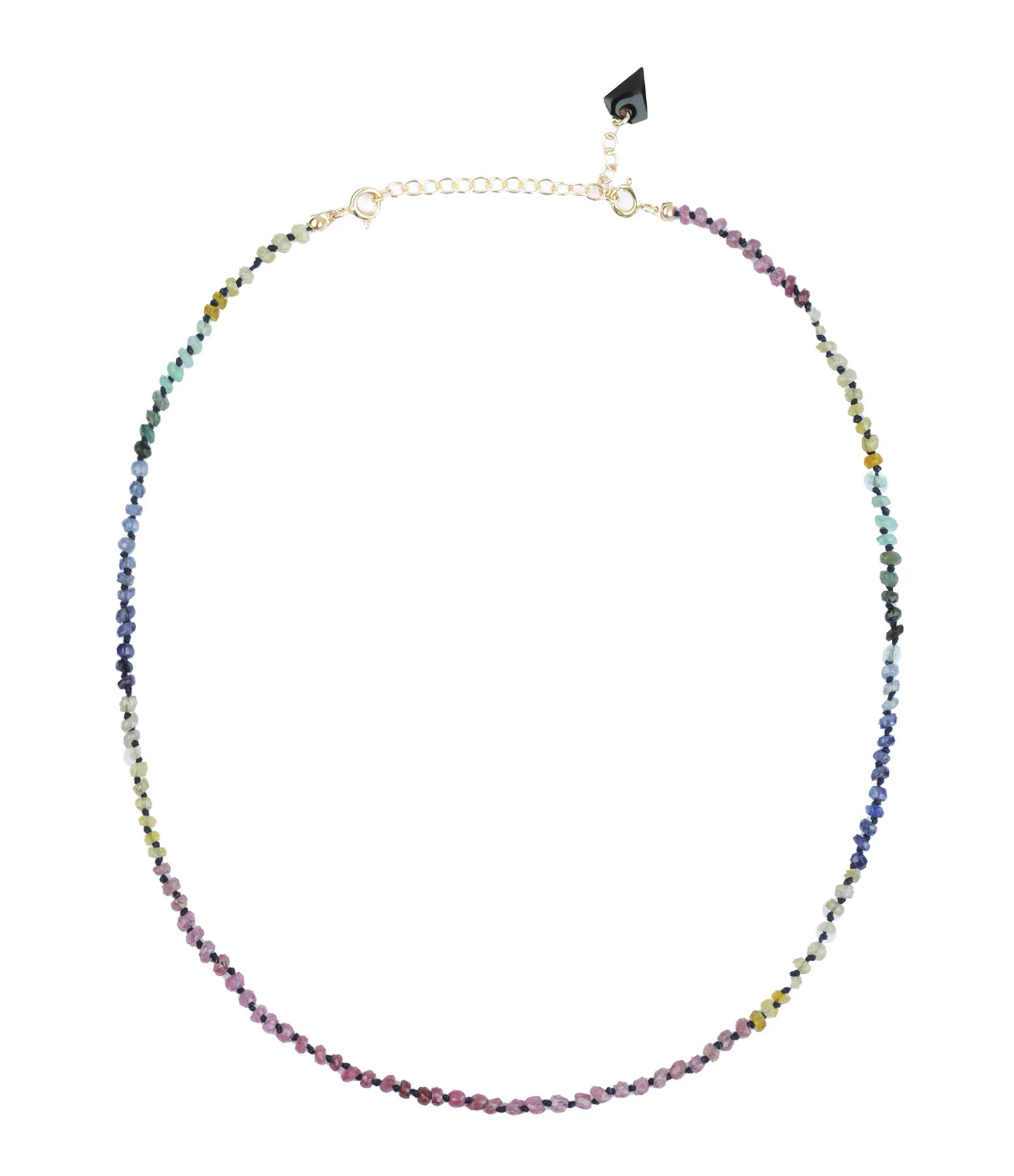 Collier en saphir sur cordon noir. Fermoir à ressort en argent plaqué or avec chaînette de réglage et rolla bolla en pierre de jade.