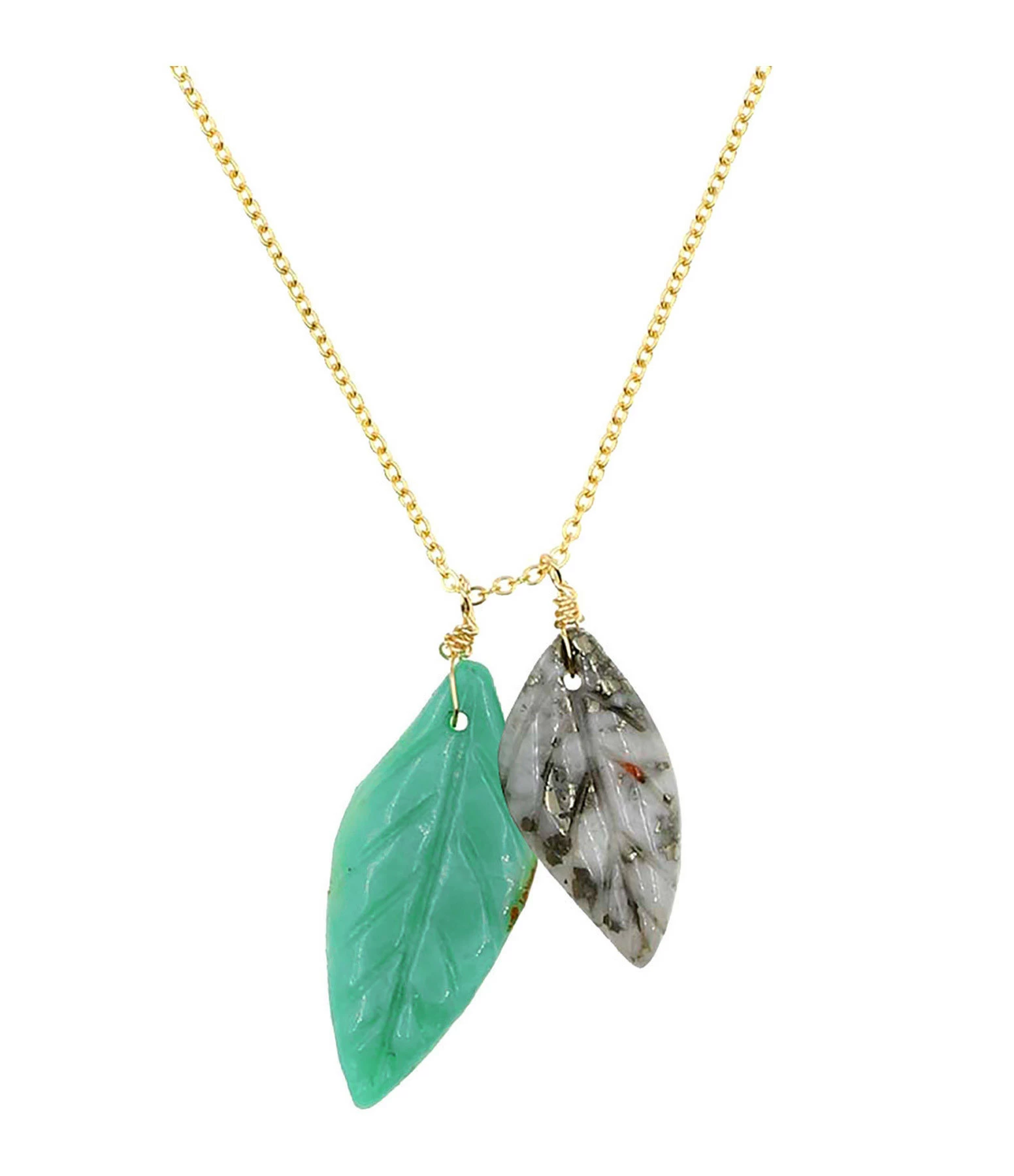 Collier sur chaîne en argent doré, avec deux pendentifs de feuilles en calcédoine et chrysoprase. Fermoir à ressort avec chaîne de réglage.
