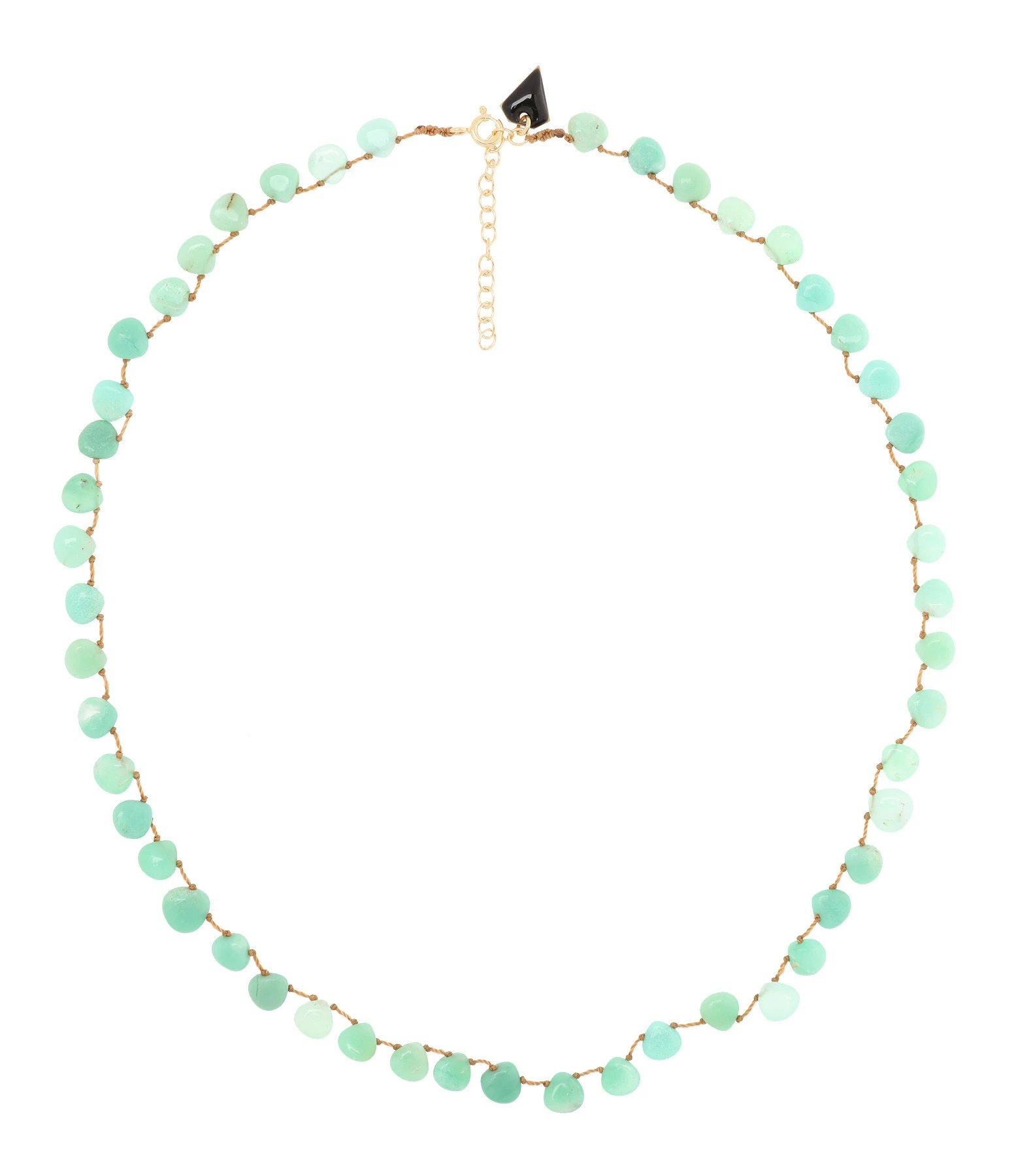 Collier en chrysoprase sur cordon beige. Fermoir à ressort en argent plaqué or avec chaînette de réglage.