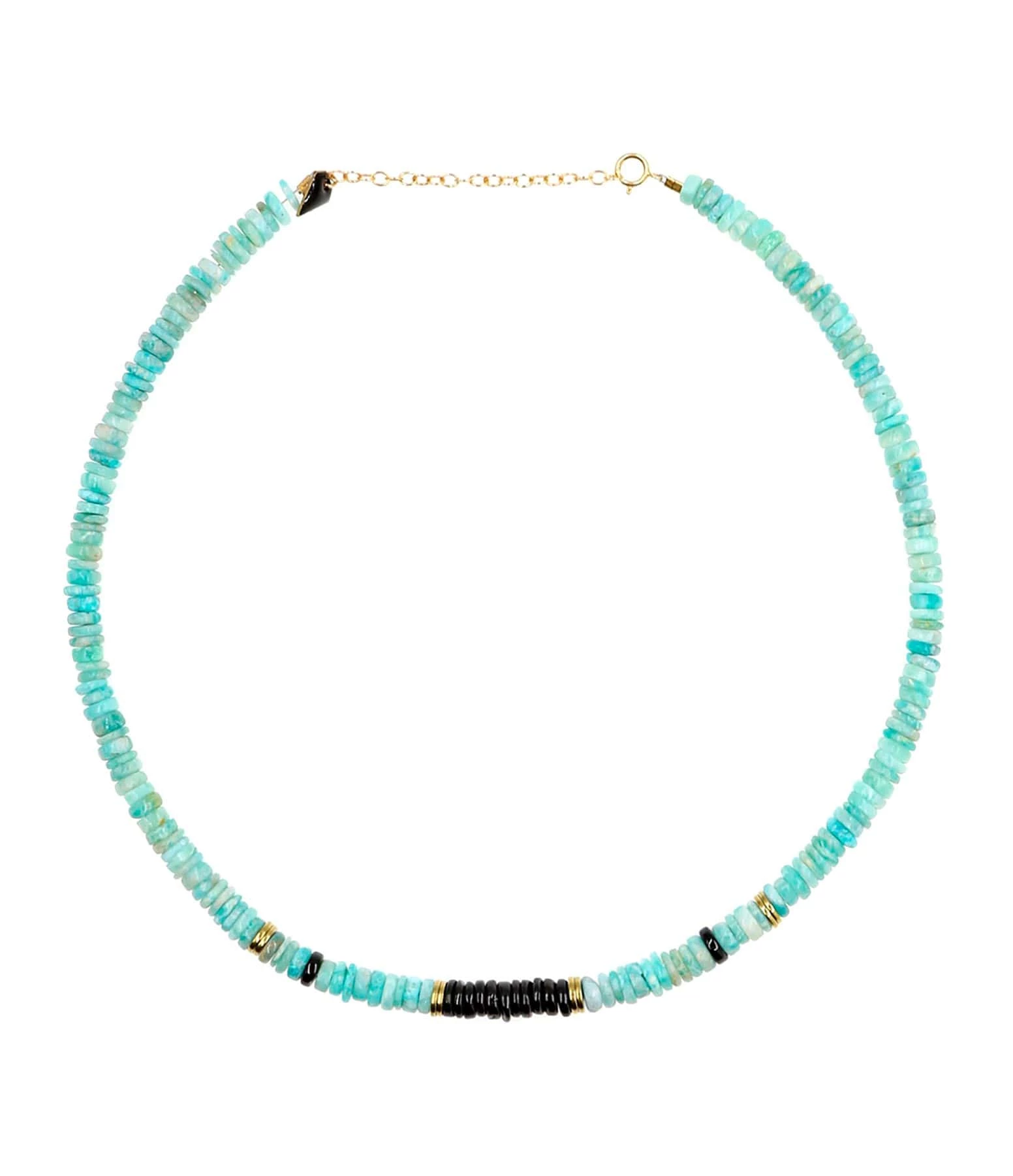 Collier en rondelles d’Amazonite et Onyx. Fermoir à ressort avec chaîne de réglage en argent doré.