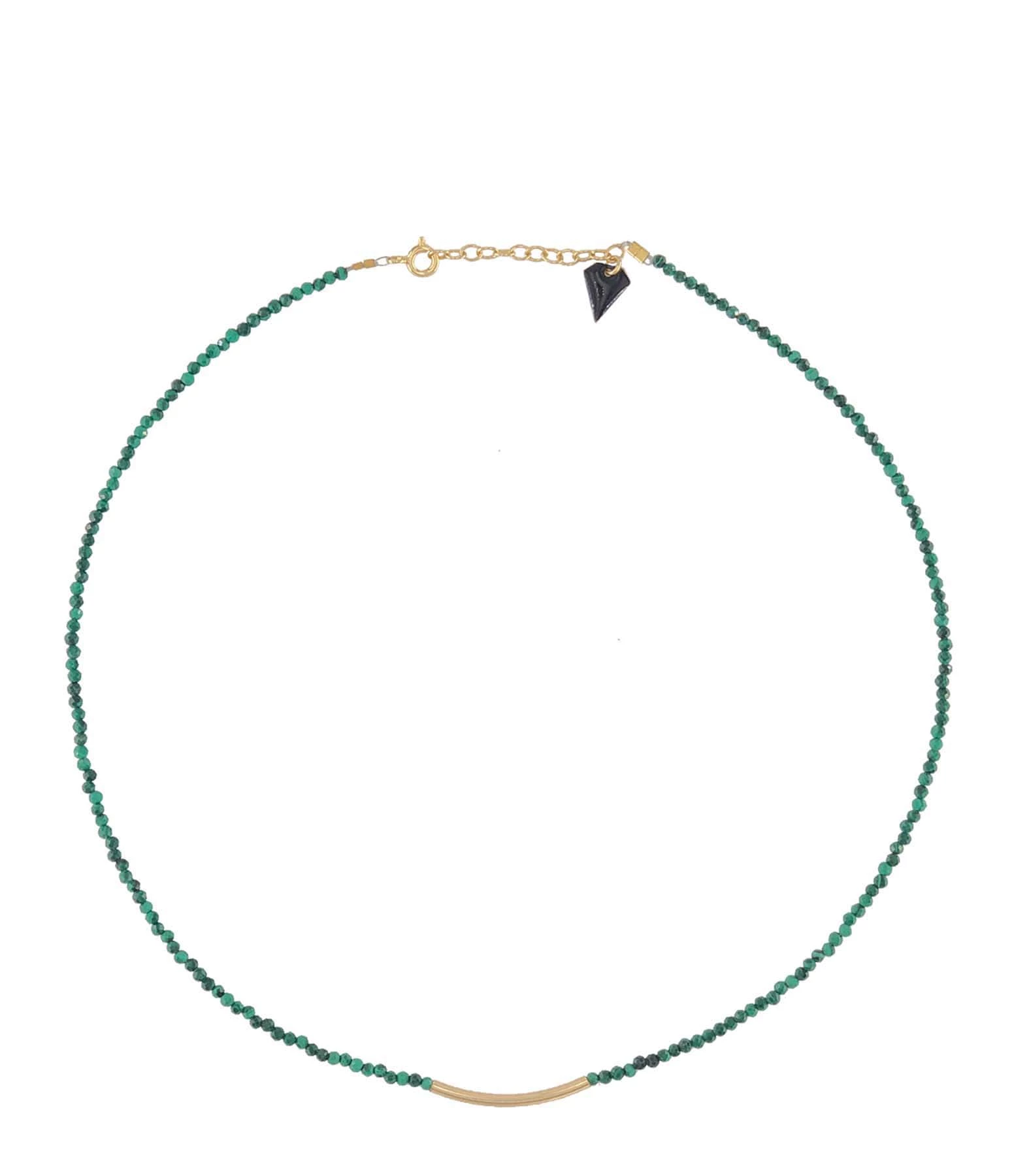 Collier en malachite agrémenté d’un tube en argent doré au centre. Fermoir à ressort avec chaîne de réglage en argent doré à l’or fin.