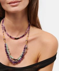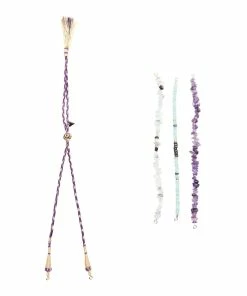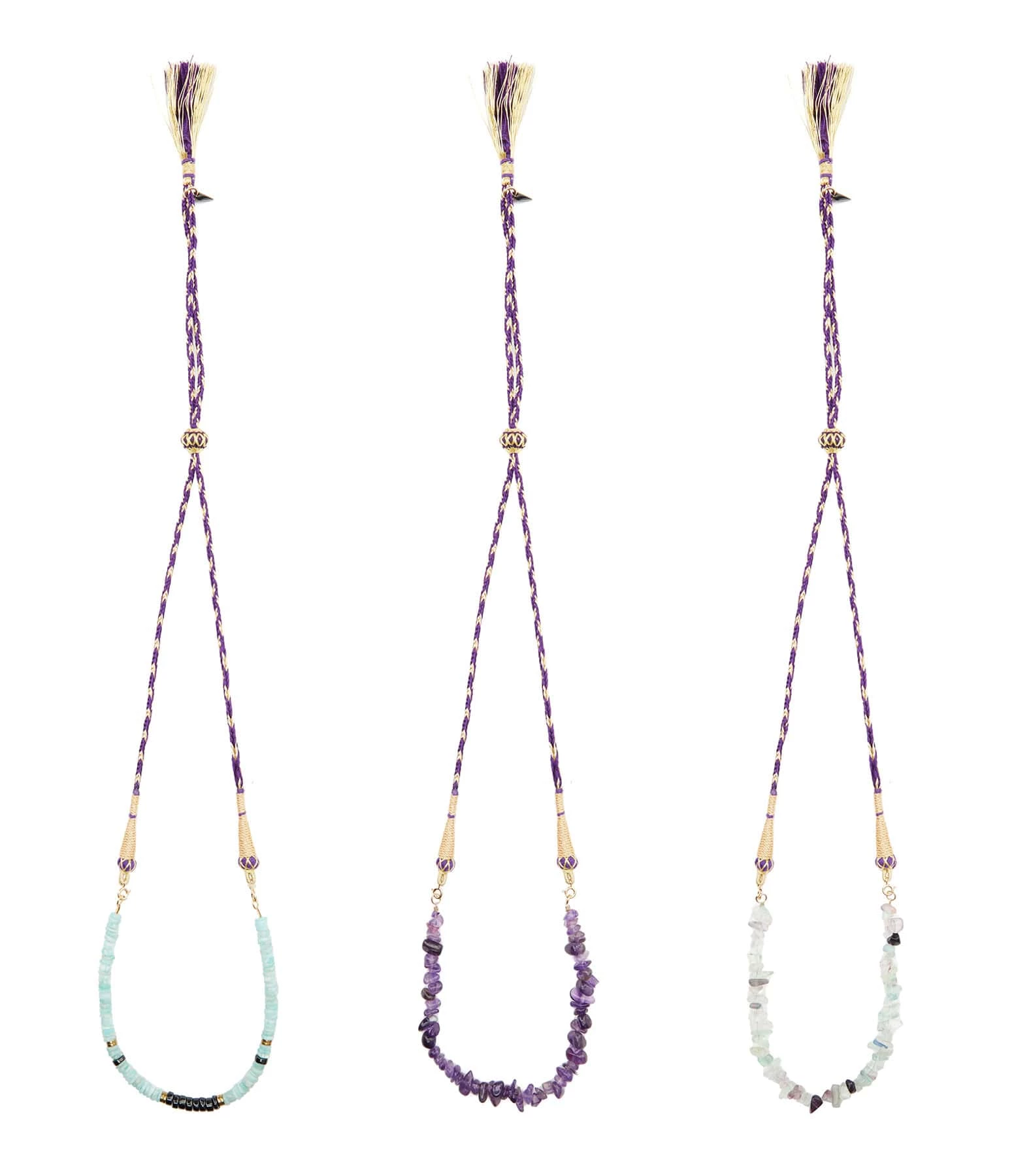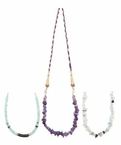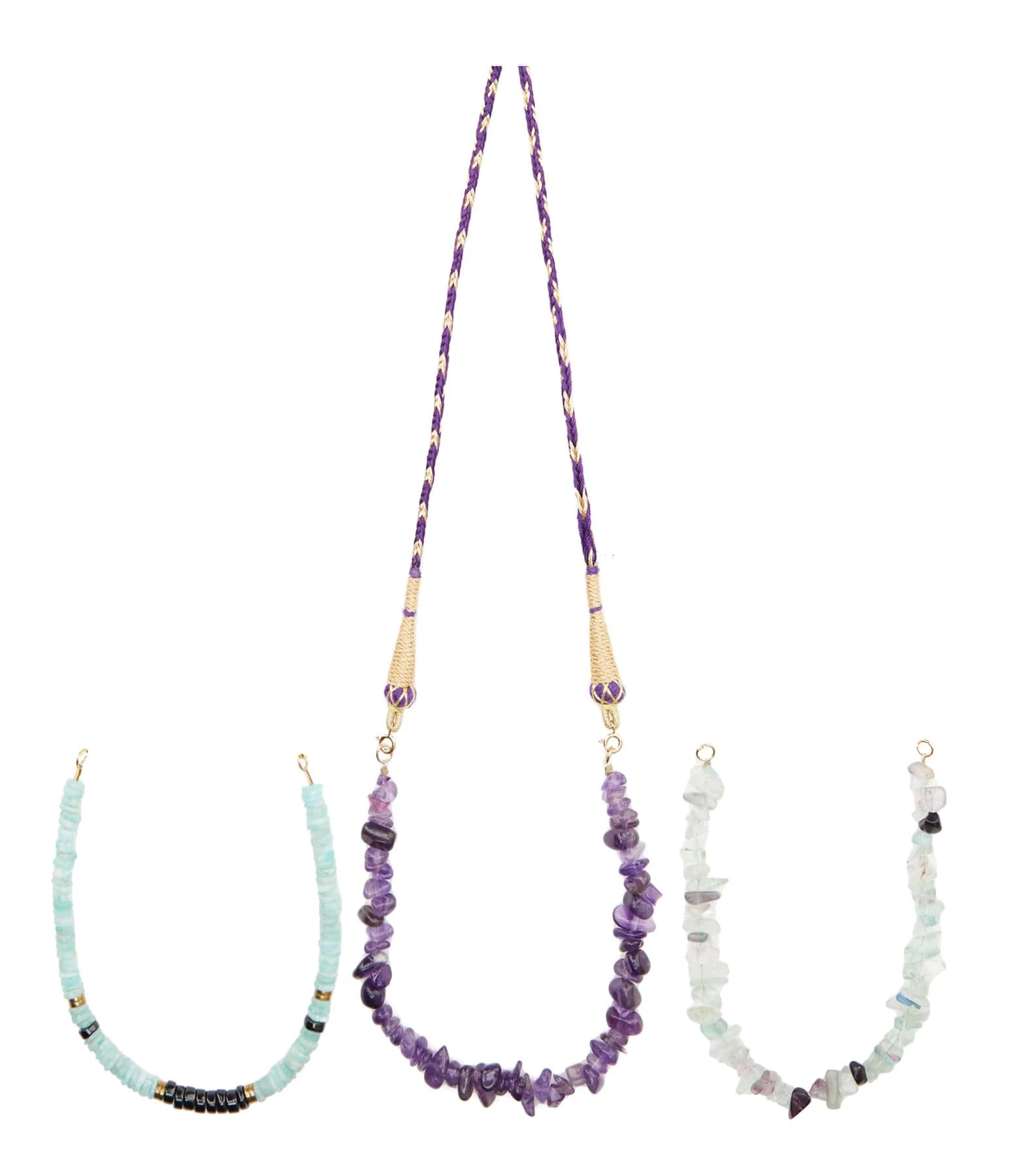Coffret avec collier en cordon doré et violet réglable par boule de serrage et pierres de fluorite, d’améthyste et d’amazonite amovibles attachées par deux fermoirs.