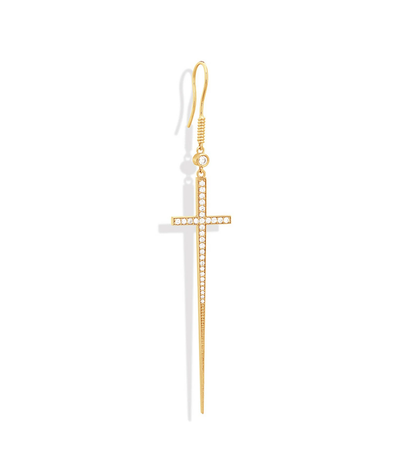 Boucle d’oreille pendante en forme de croix en or jaune sertie de diamants.