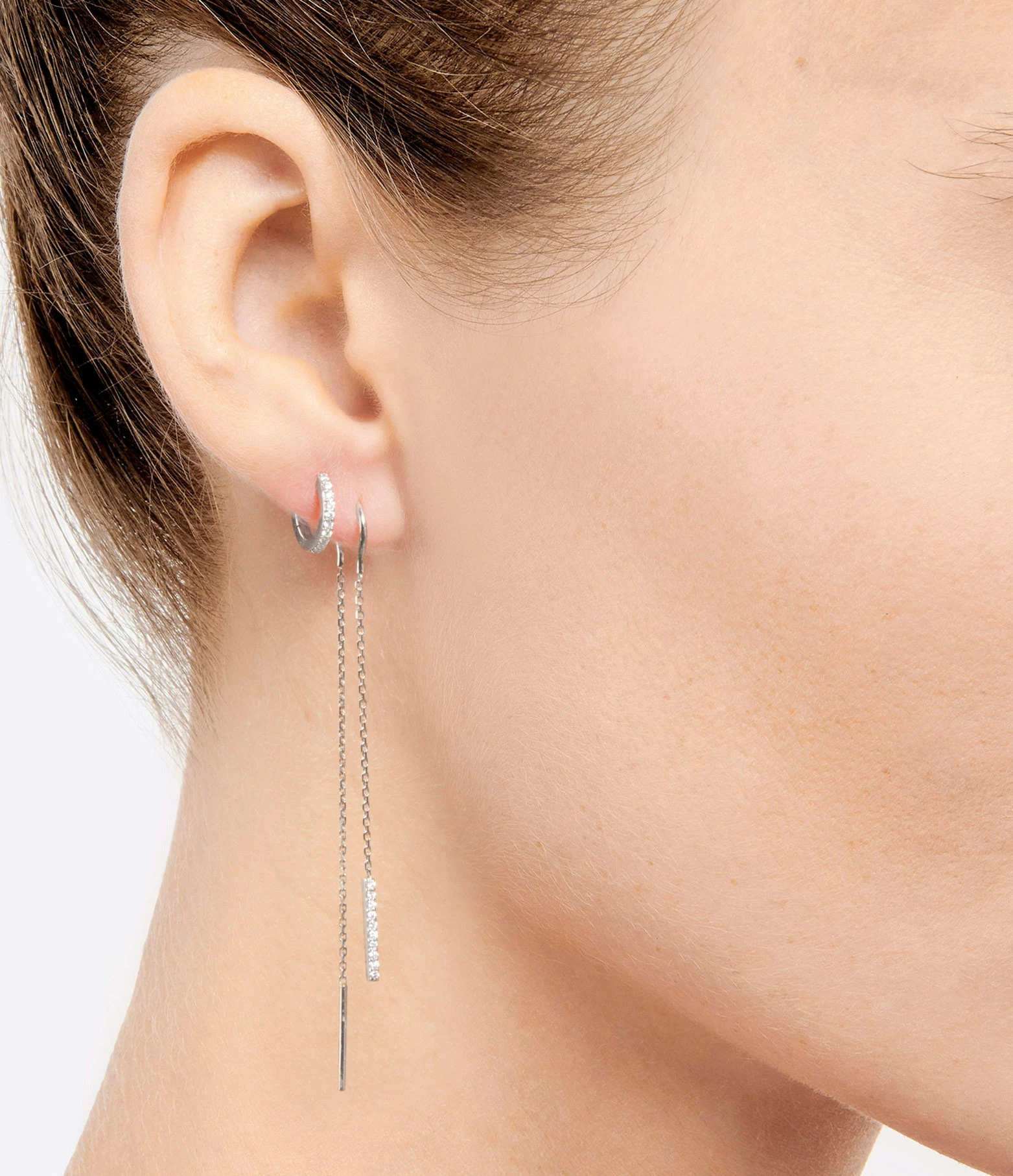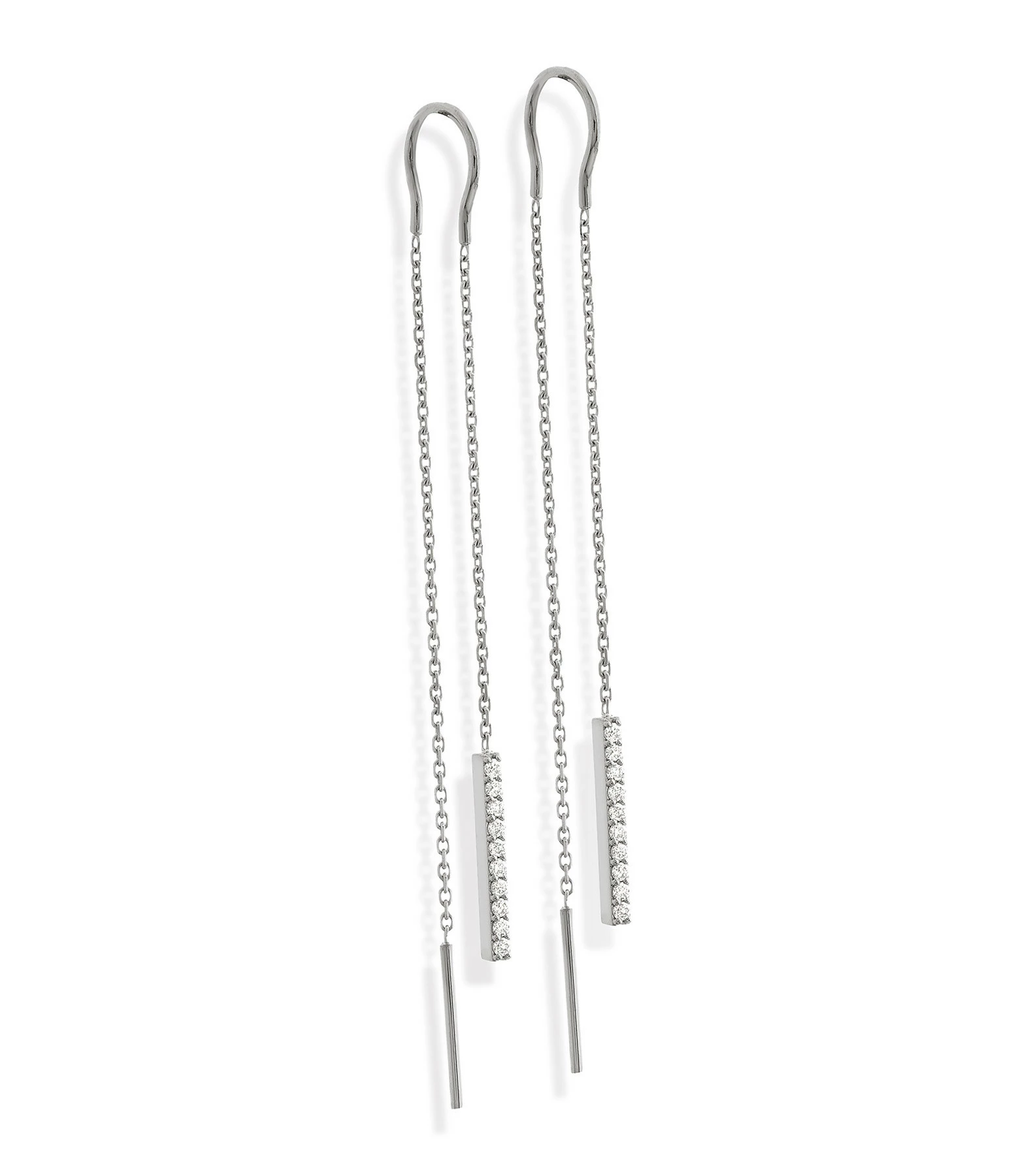 Boucles d’oreilles en or blanc, deux chaînes dont une ornée d’une barrette sertie de diamants ronds. Tige à passer dans le lobe. Pas de fermoir.