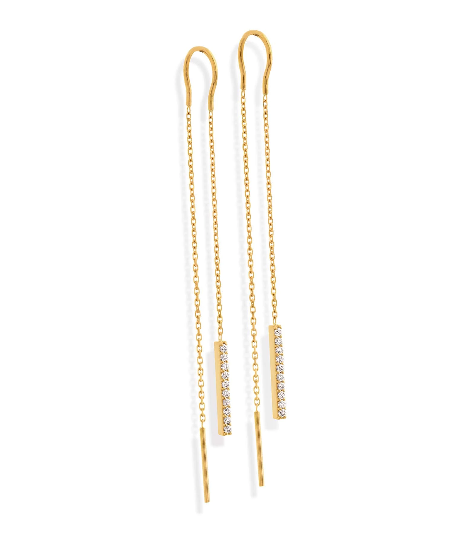 Boucles d’oreilles en or jaune, deux chaînes dont une ornée d’une barrette sertie de diamants ronds. Tige à passer dans le lobe. Pas de fermoir.
