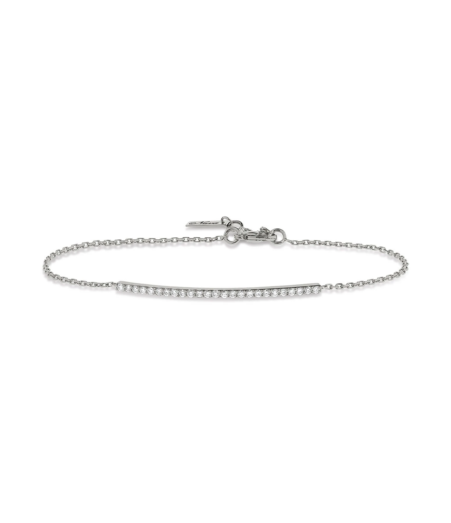 Bracelet chaîne en or blanc avec barrette ornée de diamants ronds. Fermoir à ressort avec contre-anneau.
