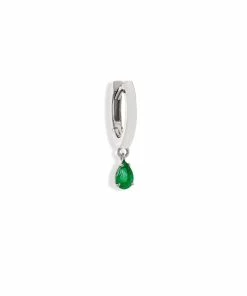Boucle d’oreille en or blanc avec pendentif émeraude taille poire. Fermoir à cliquet.
