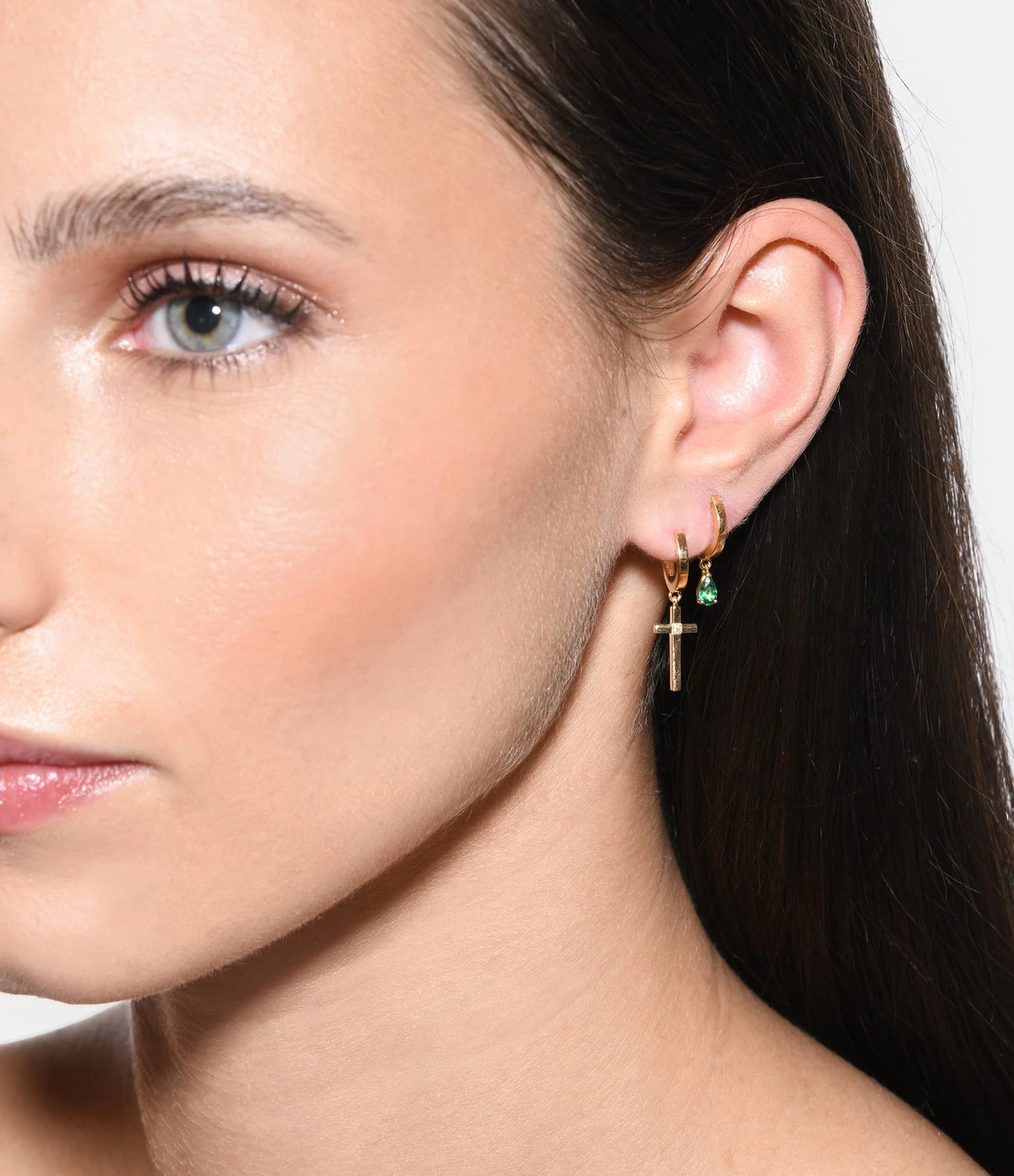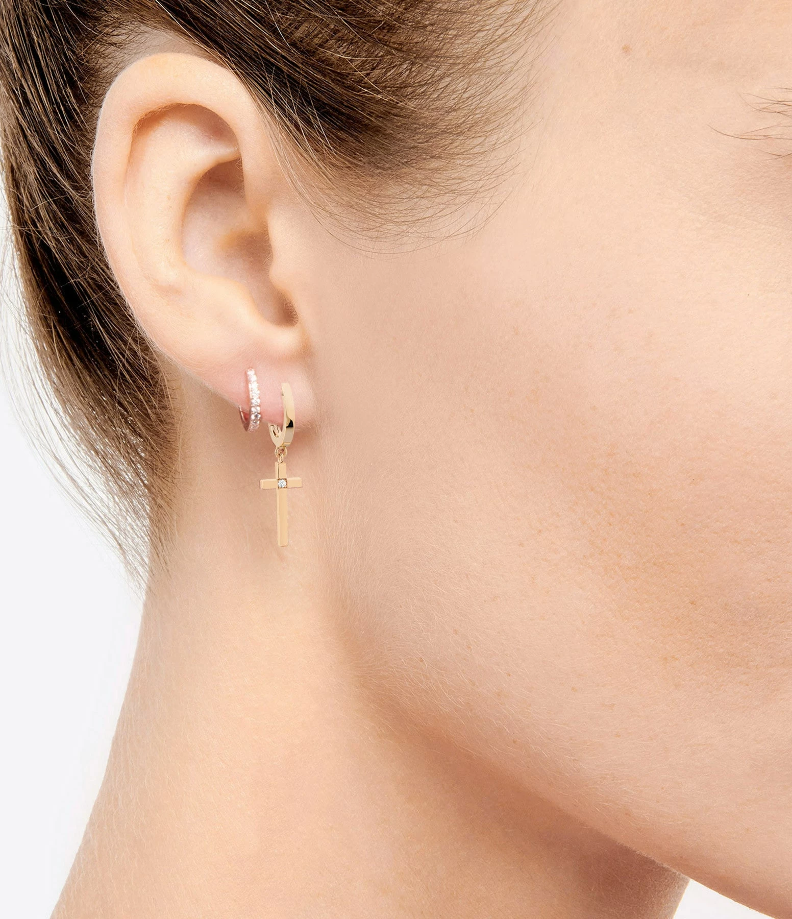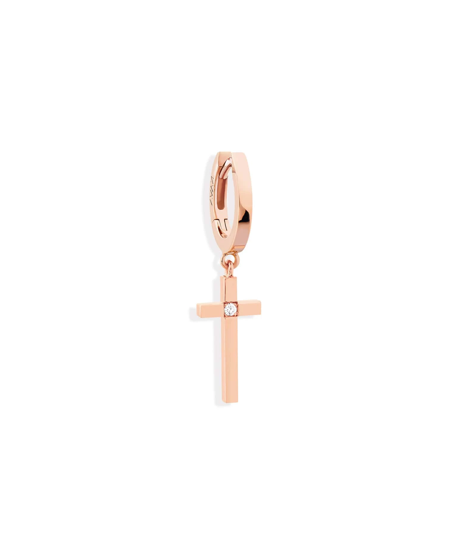 Boucle d’oreille en or rose avec croix sertie d’un diamant central. Fermoir à cliquet.