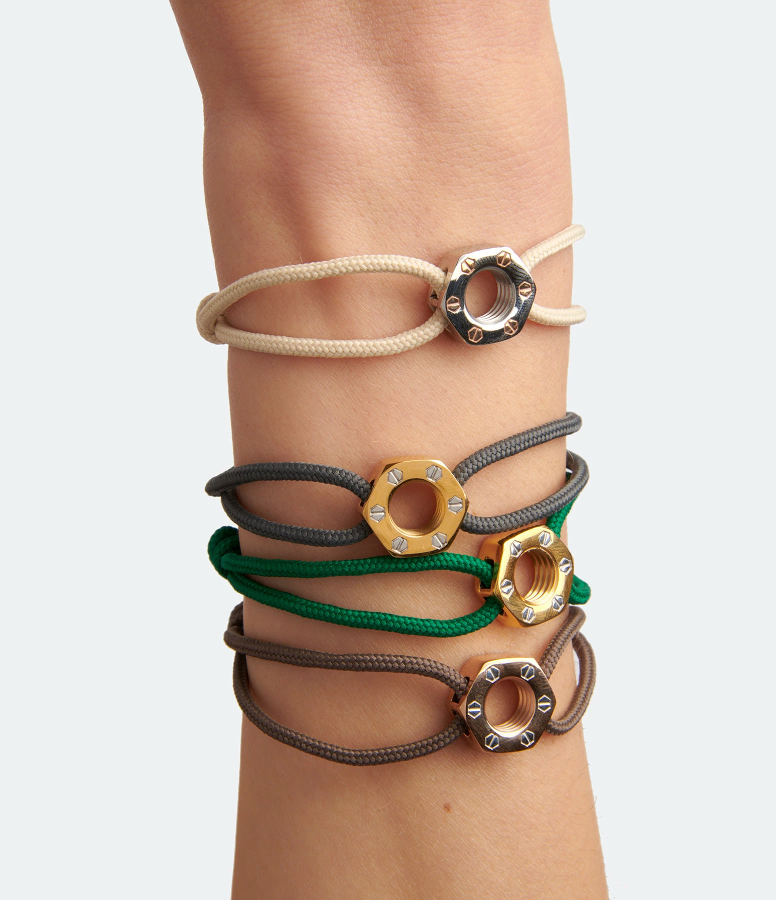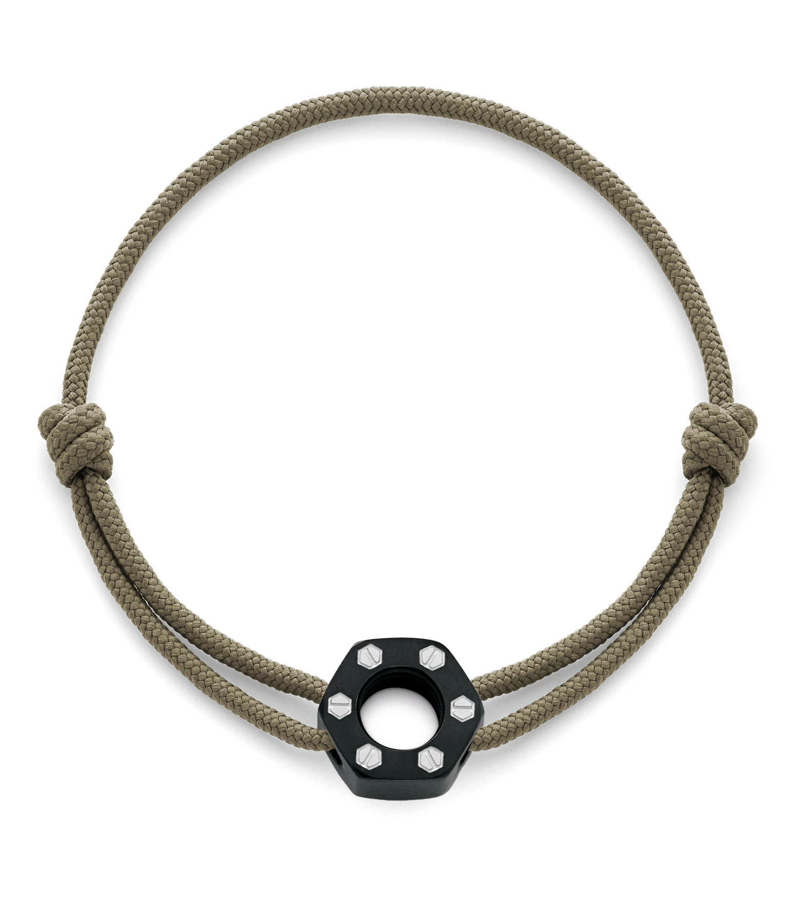 Bracelet sur cordon agrémenté d’un écrou en acier noir et détails argentés. Cordon ajustable par nœud coulissant.