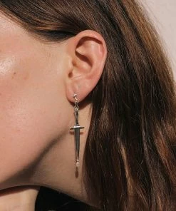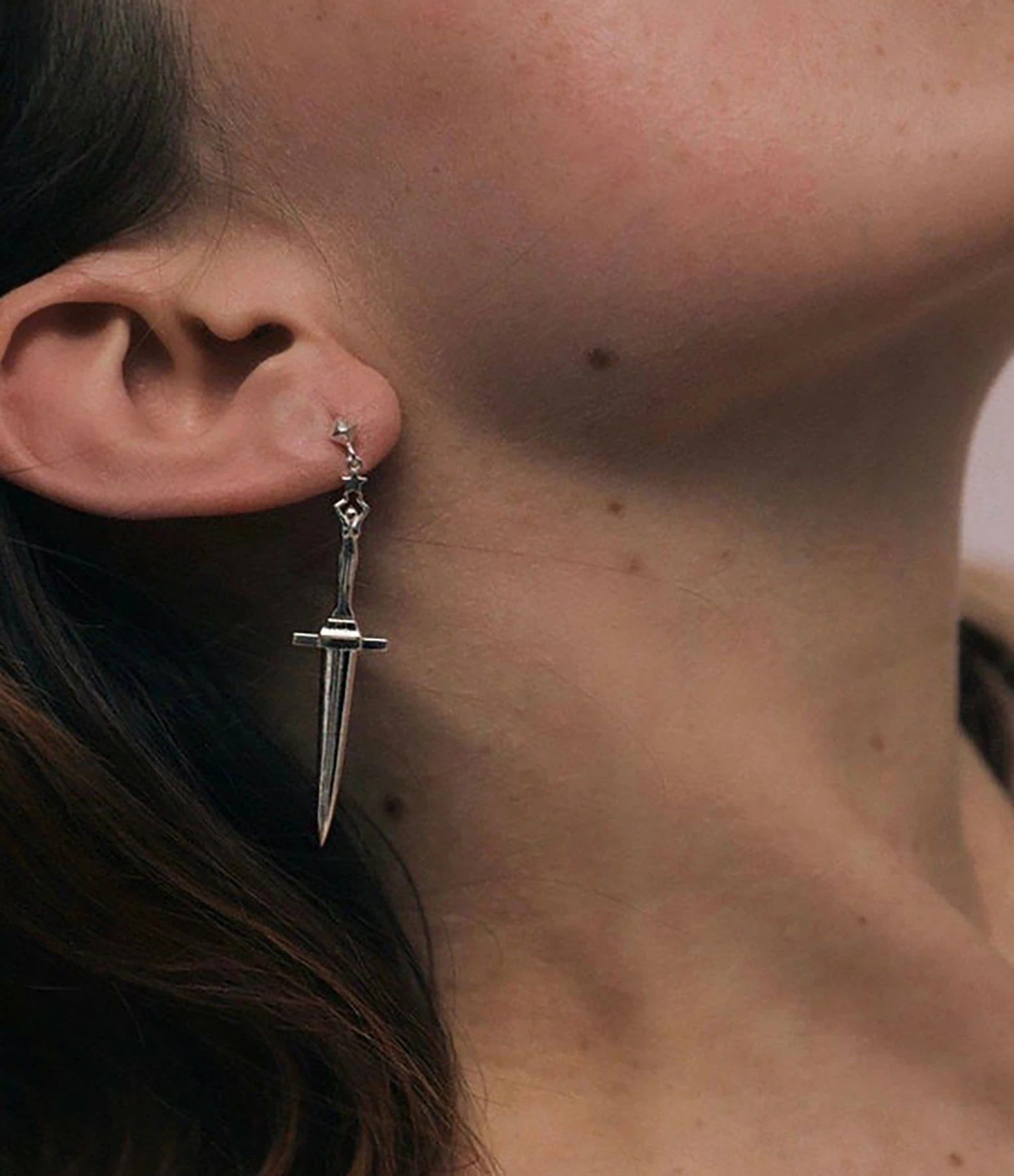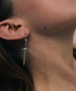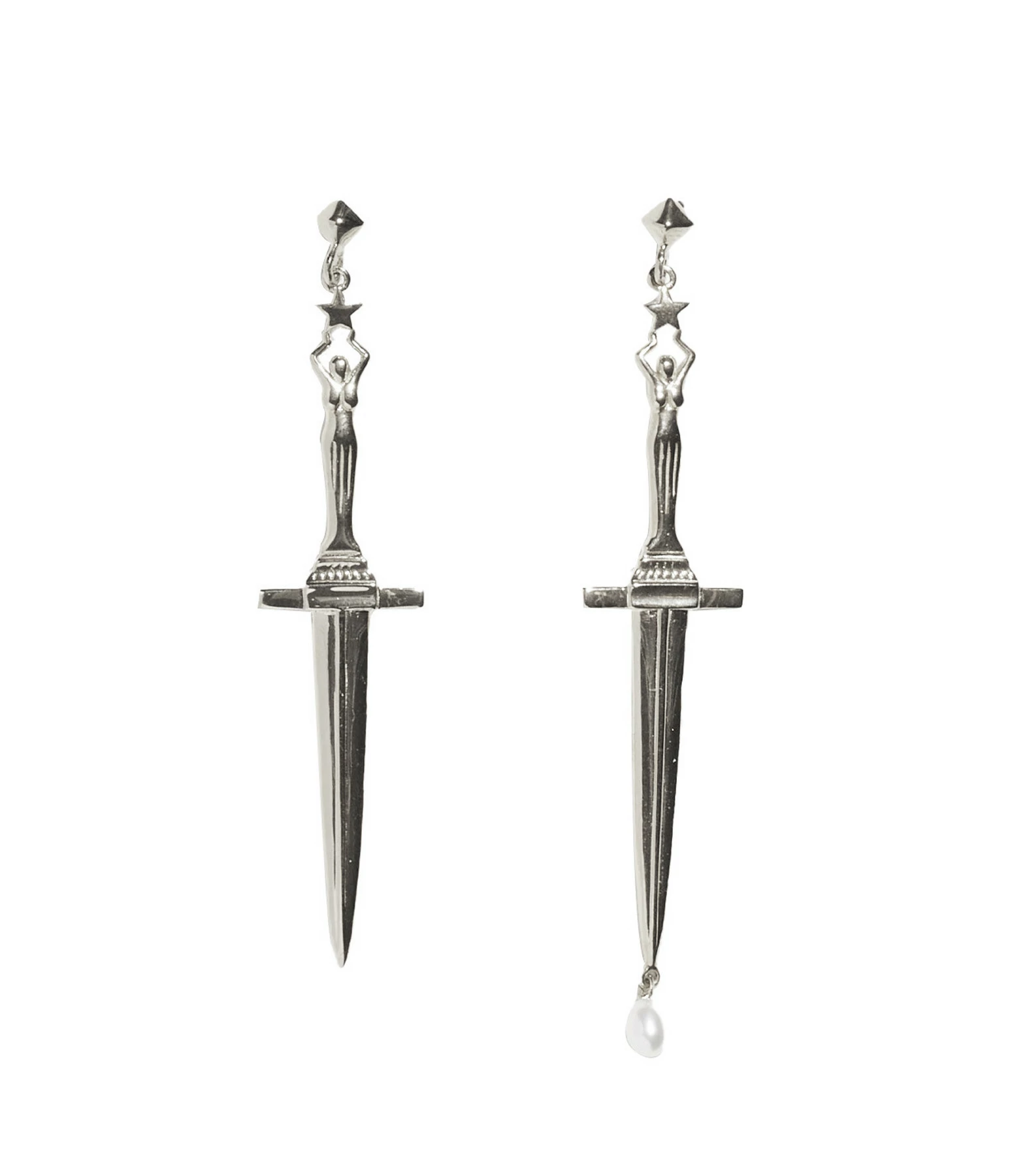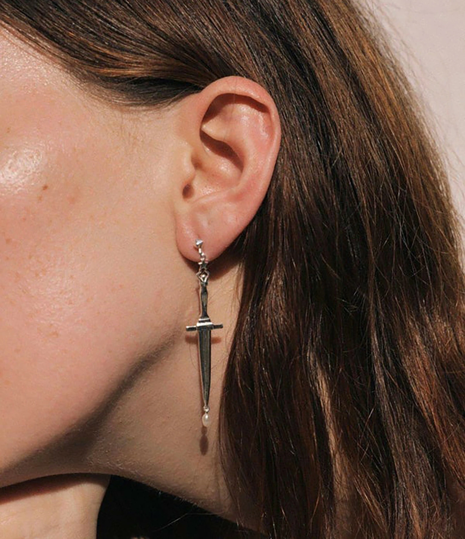 Boucles d’oreilles en argent représentant un poignard, l’une est ornée d’une goutte en perle nacrée en son bout. Fermoirs poussettes.