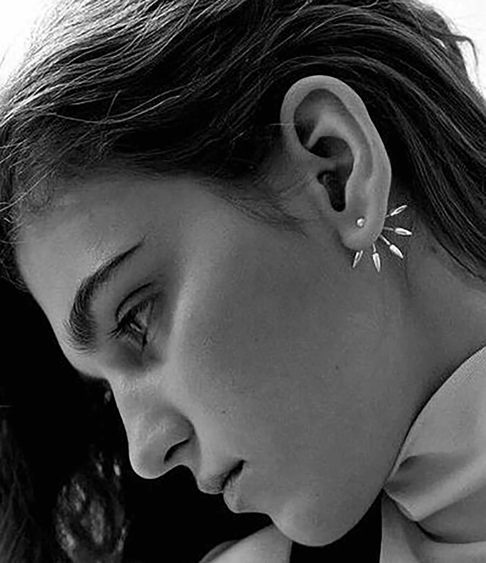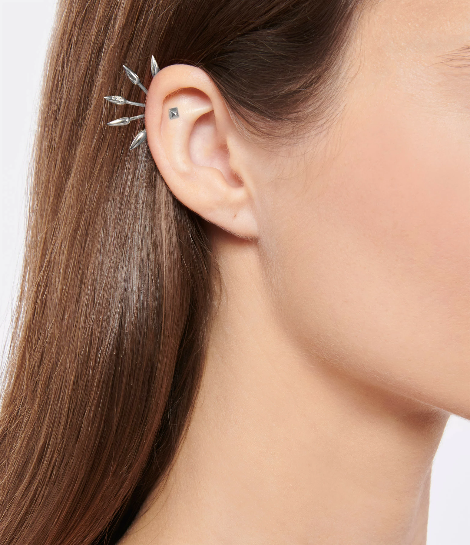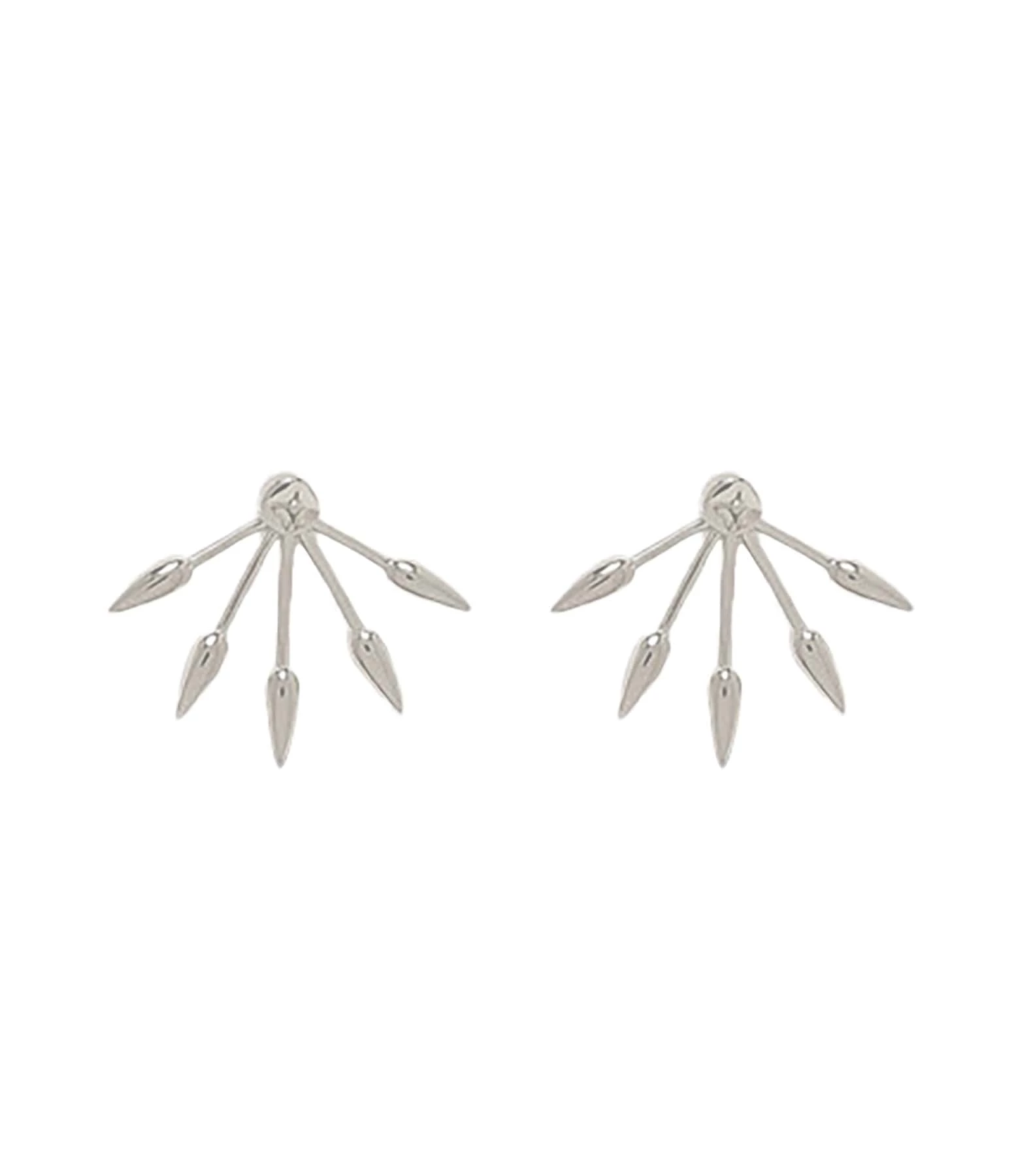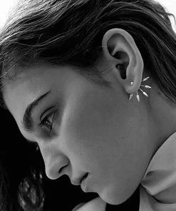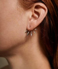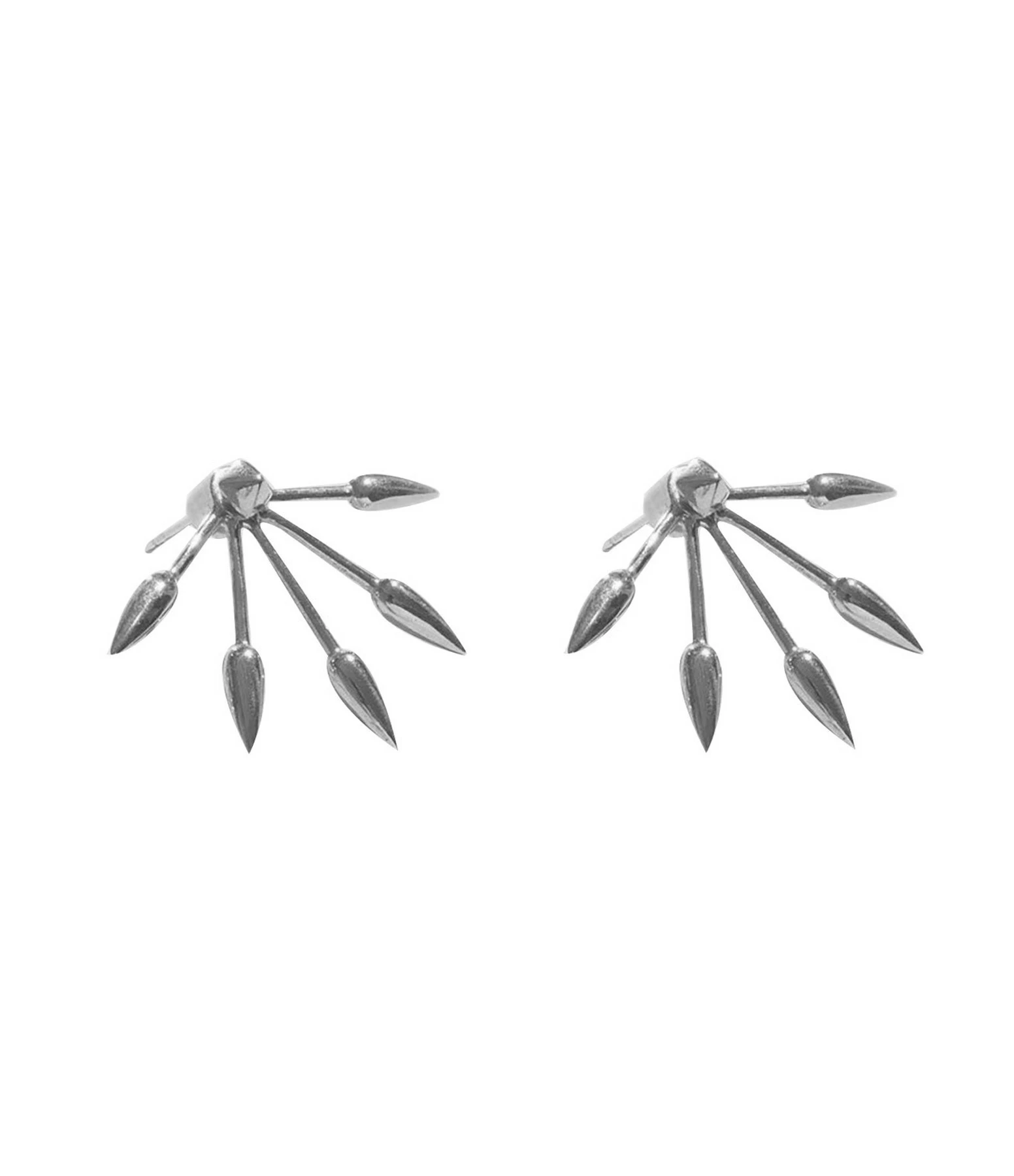 Boucles d’oreilles en argent en deux parties : un clou pyramidale et un fermoir à cinq pointes. À porter au lobe ou à l’hélix.