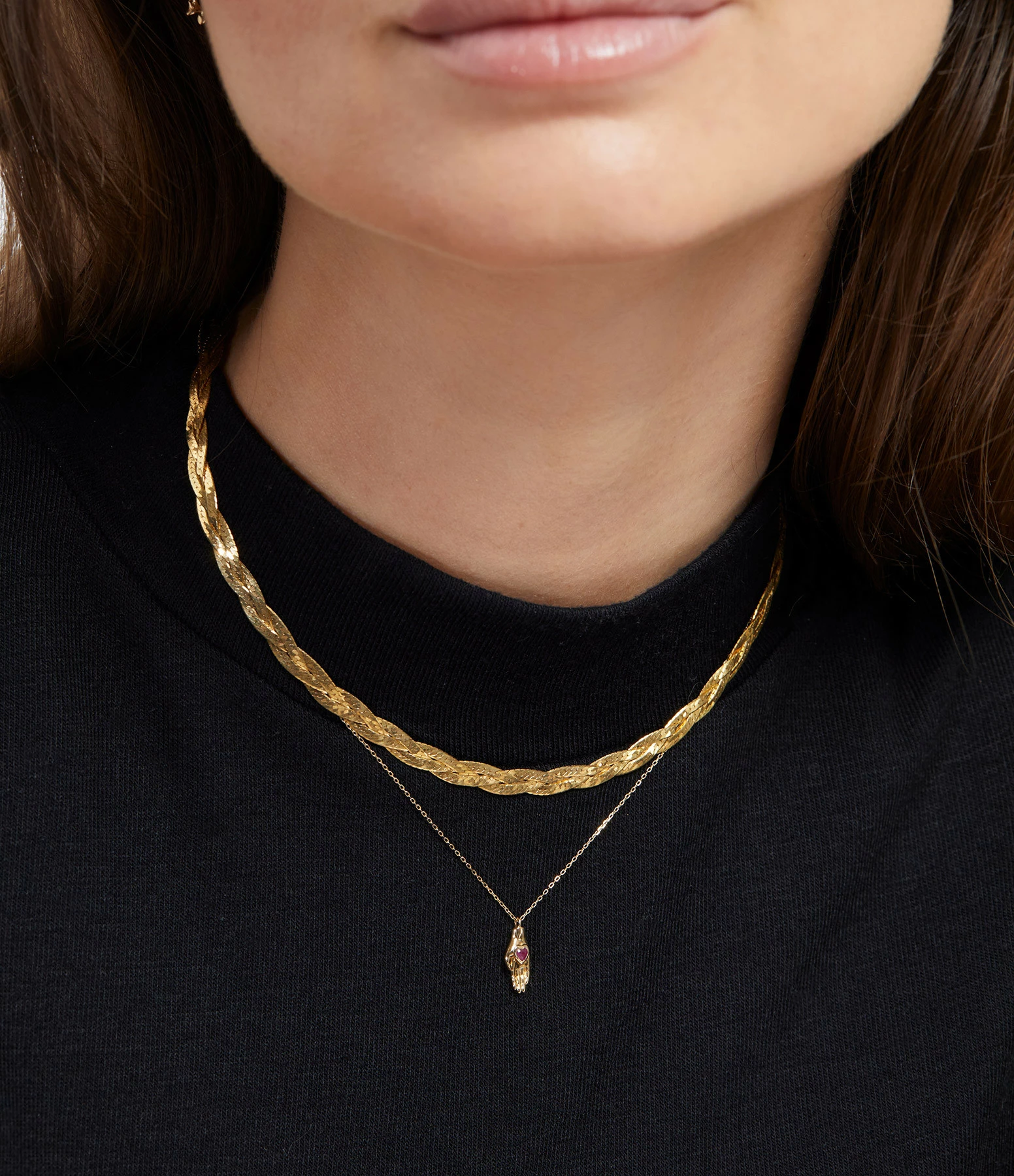 Collier mi-long en or jaune. Main ouverte soigneusement sculptée à la main, accentuée par un rubis rouge profond en forme de cœur. Réalisé en or jaune 14 carats recyclé.