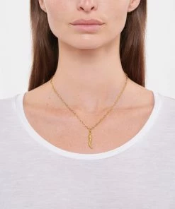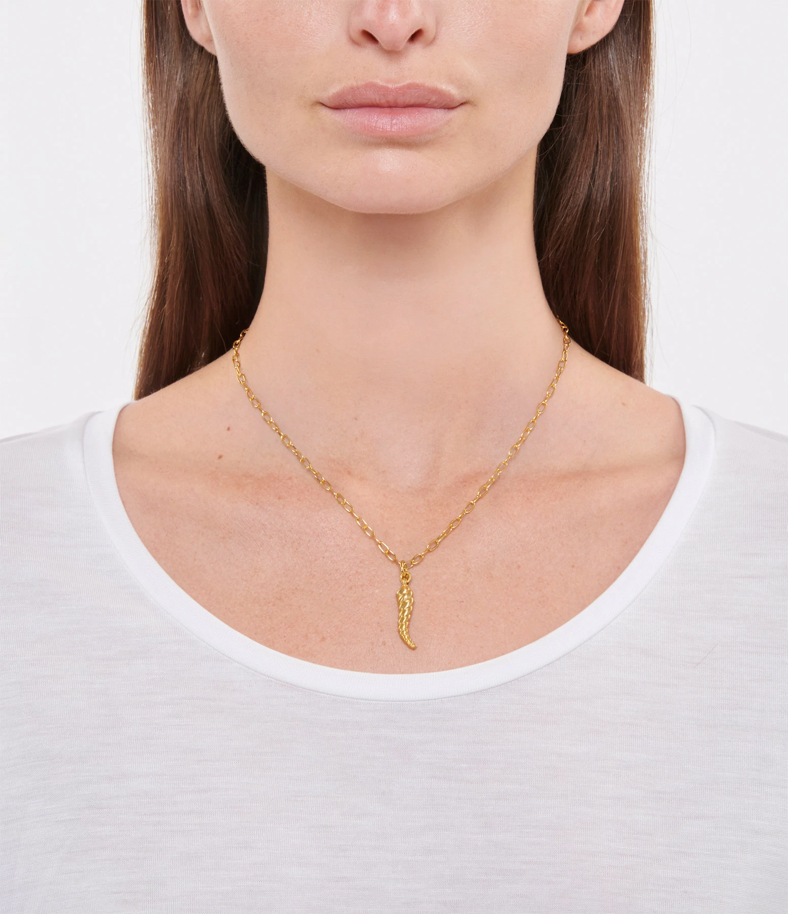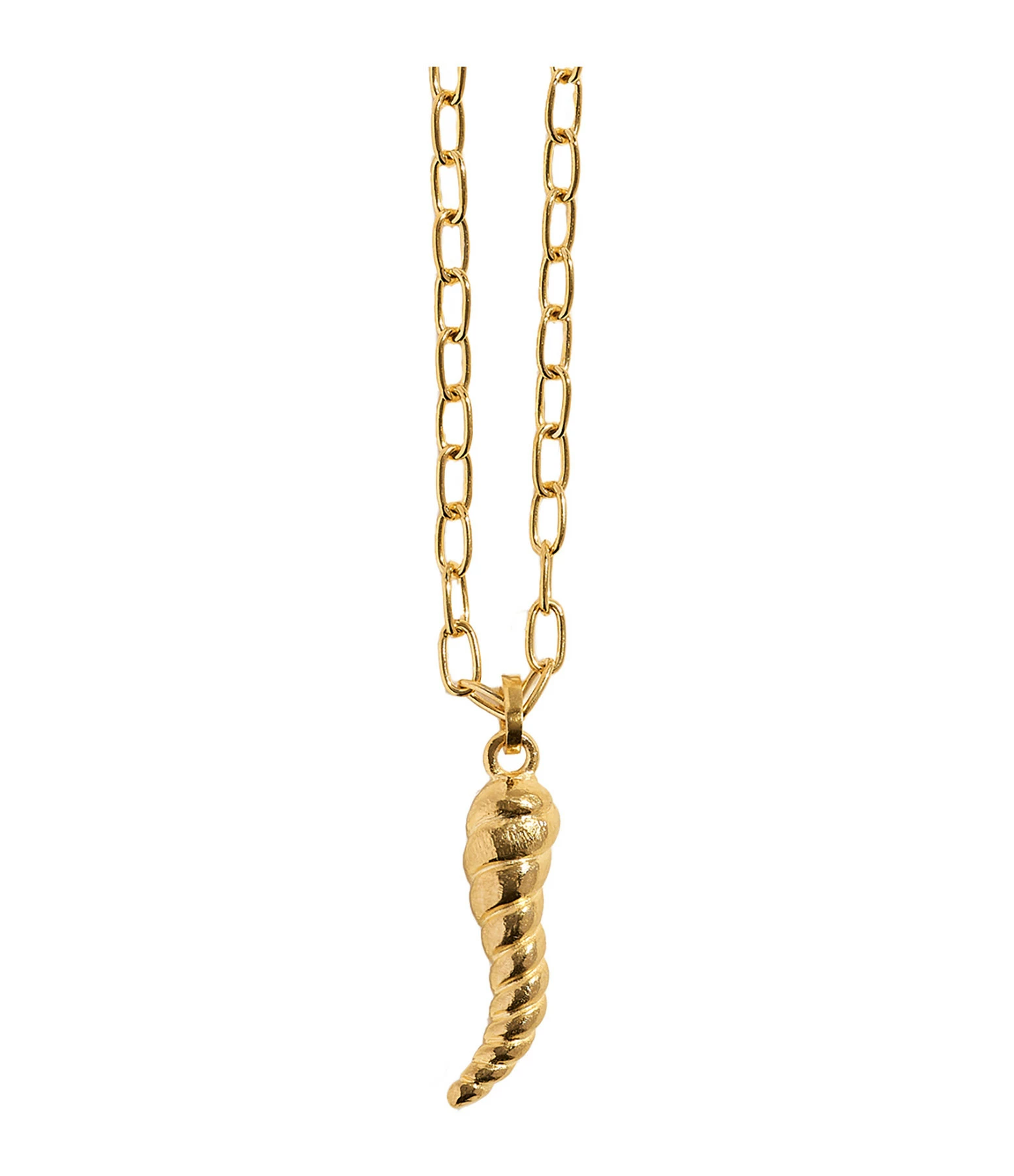 Collier en laiton doré avec pendentif corne. Fermoir classique à ressort.