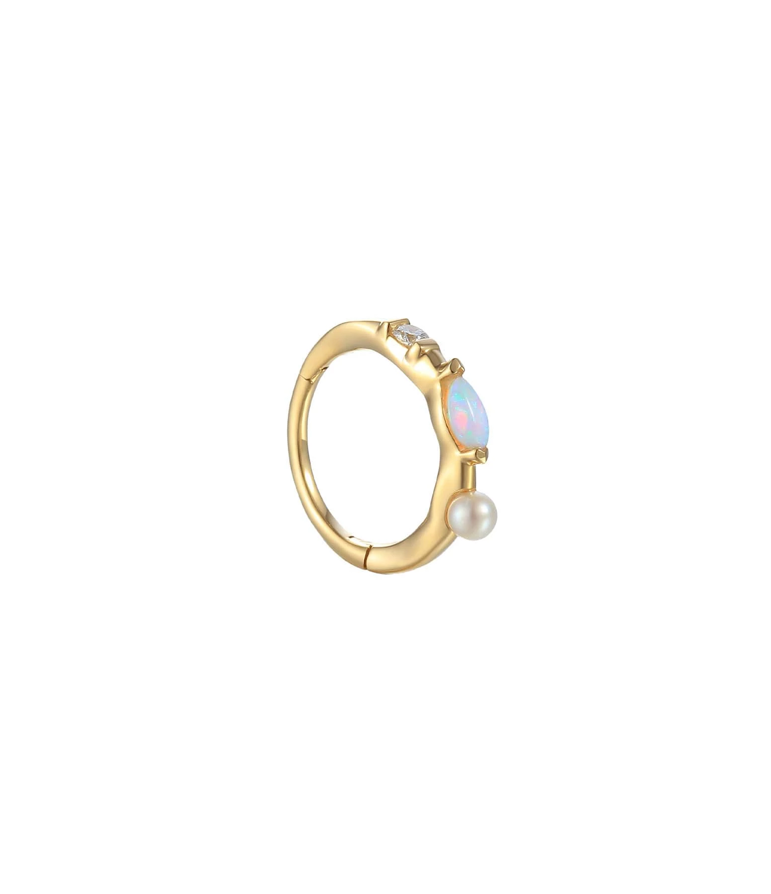 Mini créole en or jaune ornée d’un diamant blanc, une opale ovale et une perle d’eau douce. Fermoir cliquet.