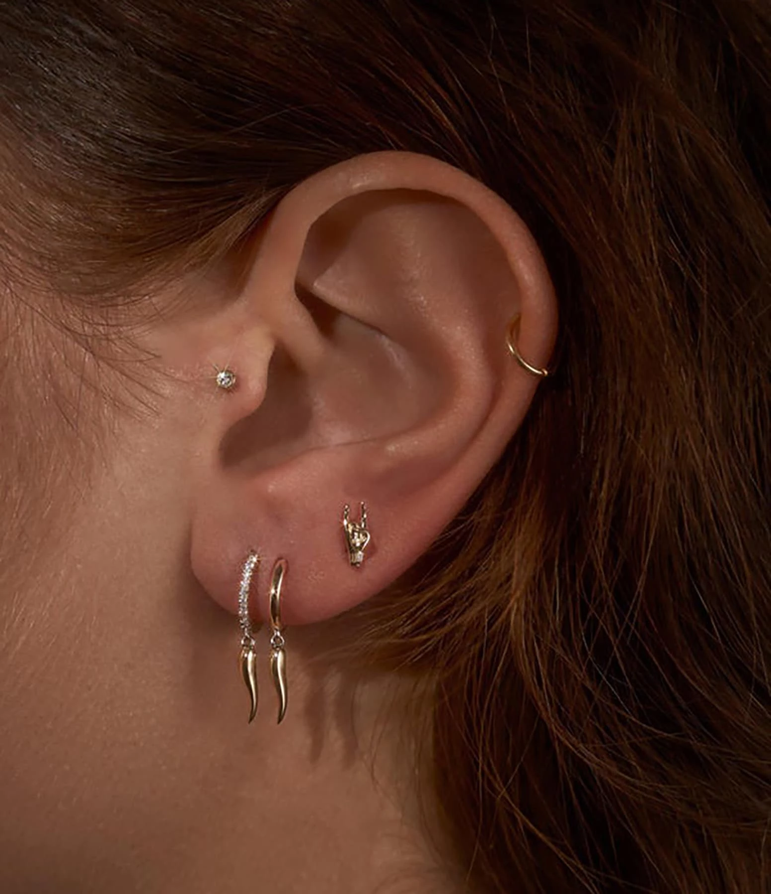 Mini créole en or jaune ornée d’une mini corne italienne ou Corno Portafortuna littéralement «corne porte-bonheur» en italien, une amulette portée pour se protéger du mauvais œil et de la malchance et favorisant la fertilité. Fermoir cliquet.