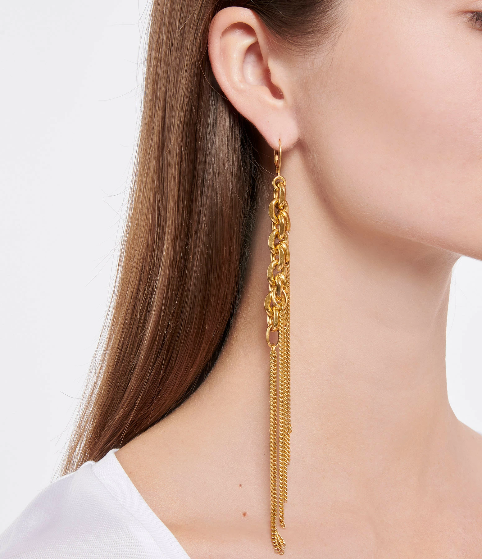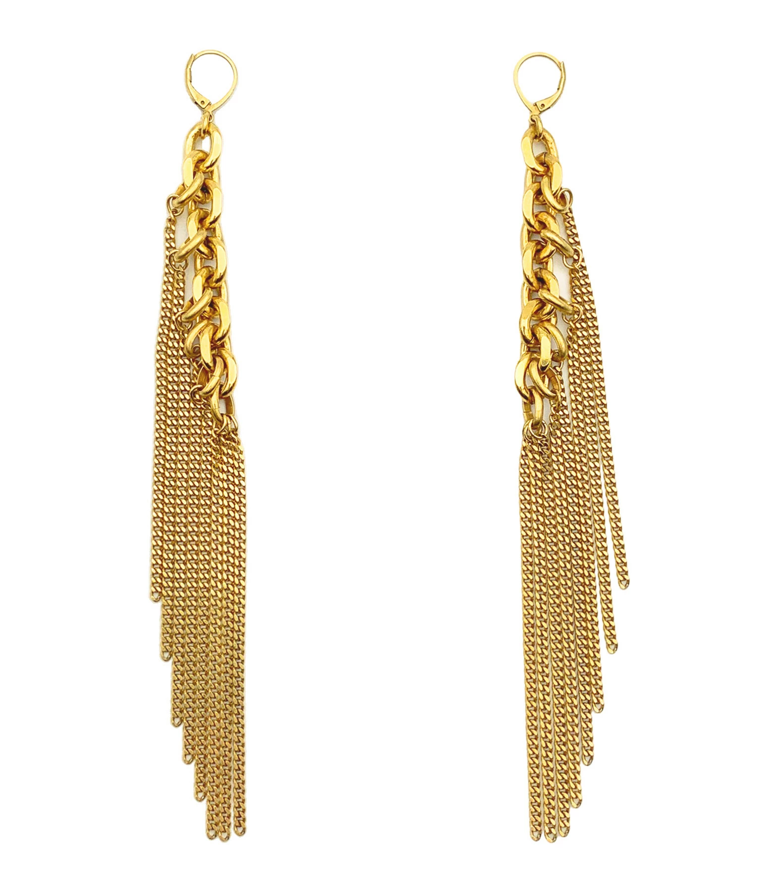 Boucles d’oreilles pendantes en laiton doré. Fines chaînes et gros maillons plats entremêlés. Fermoir poussette.