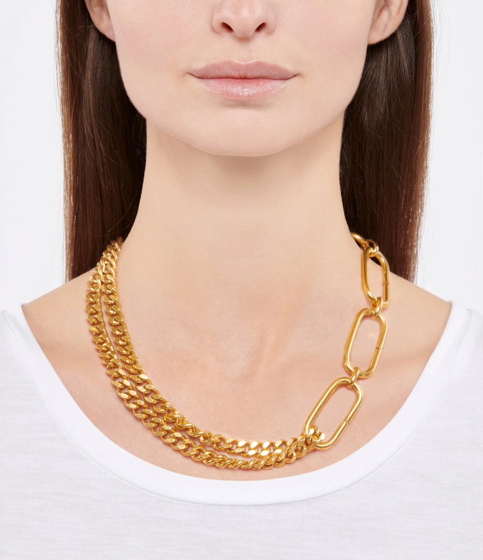 Collier en laiton doré, deux chaînes fines et maillons ovales entremêlés. Fermoir mousqueton.
