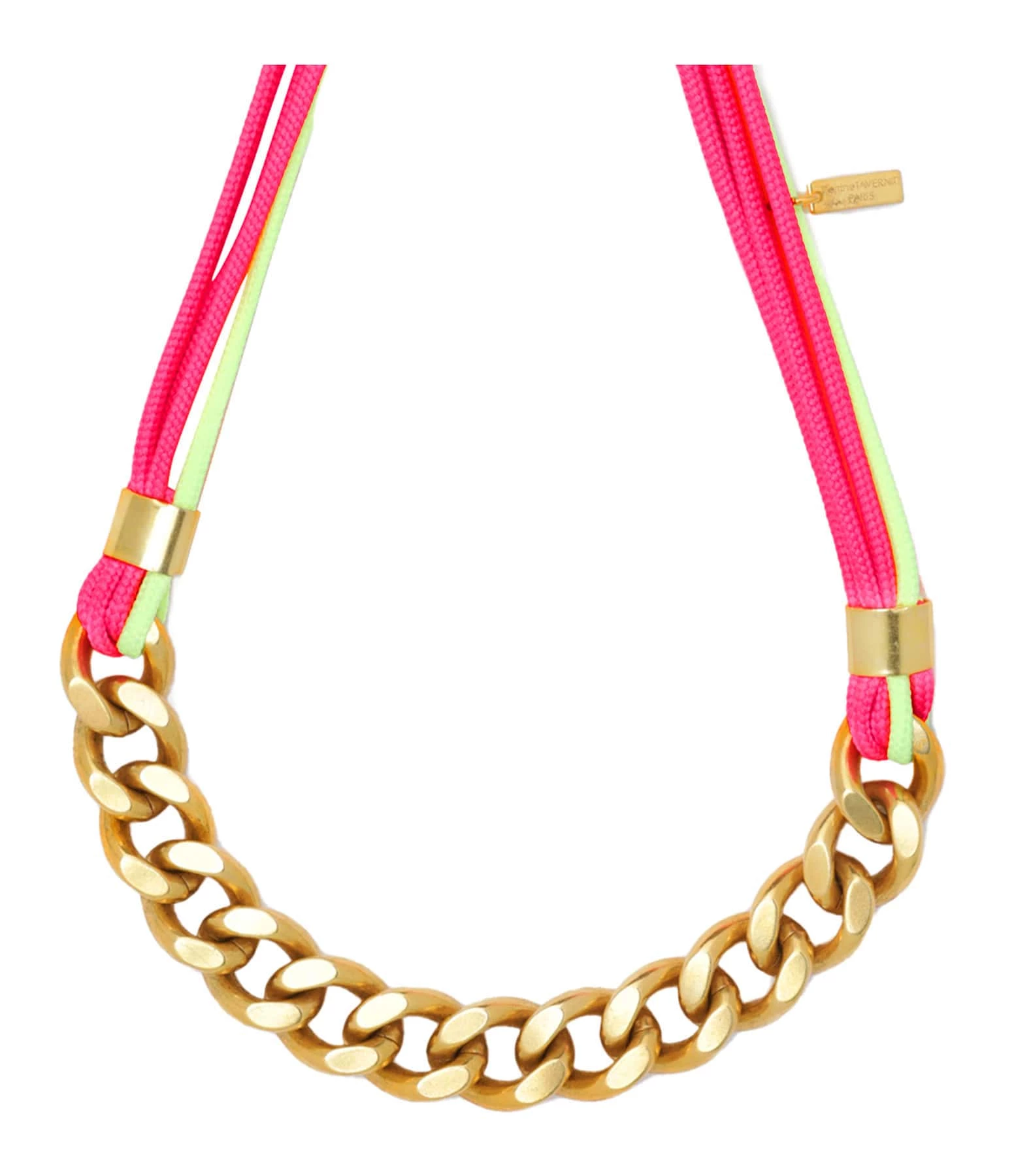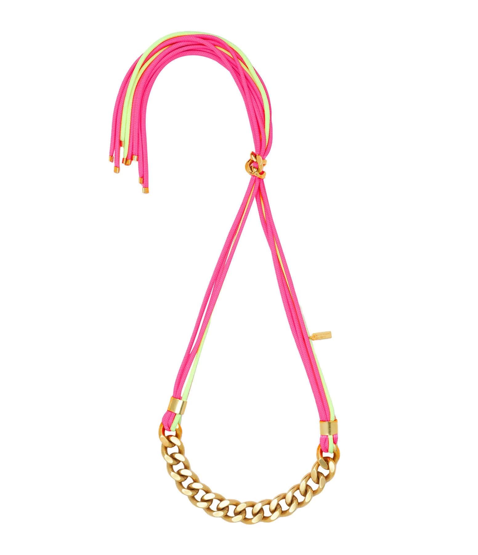 Collier en plaqué or patiné avec maillons entrelacés de cordons rose fluo.