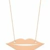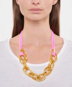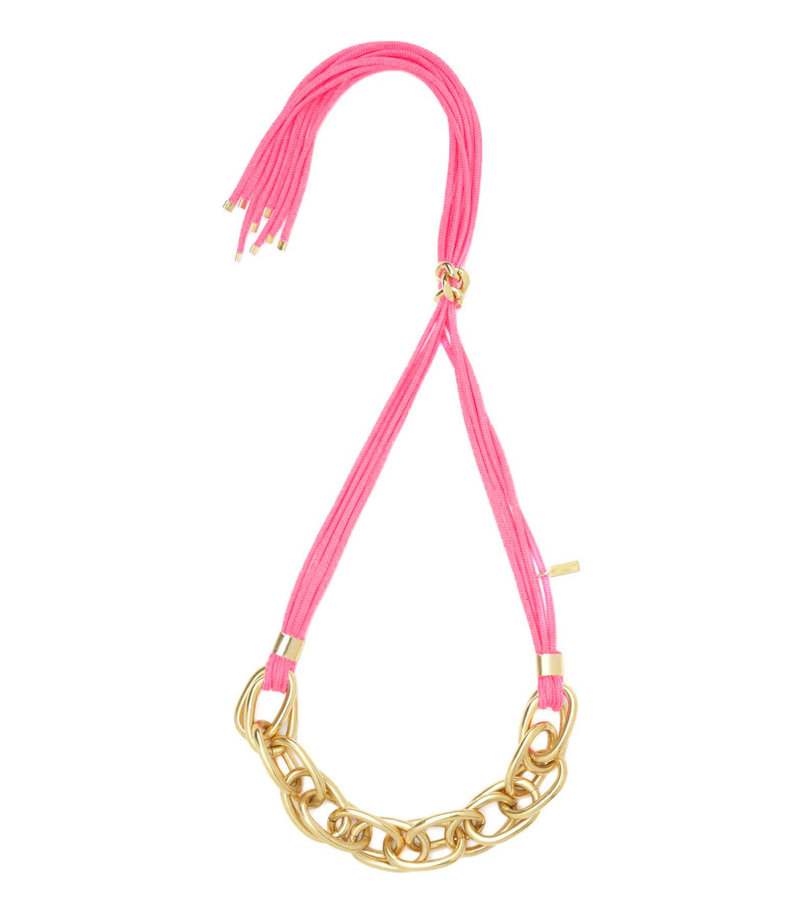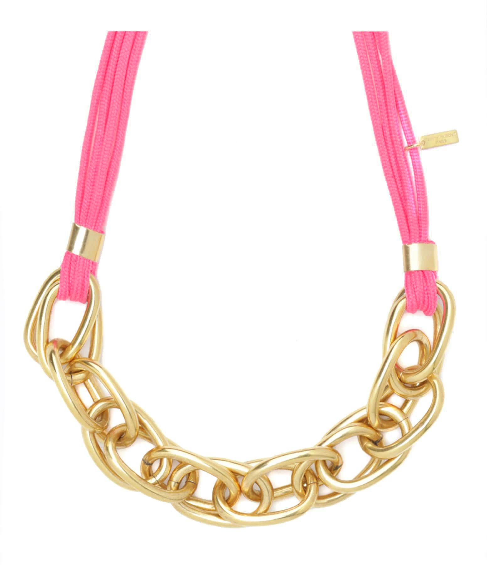 Collier long avec gros maillons dorés et liens roses. Longueur réglable par maille coulissante.