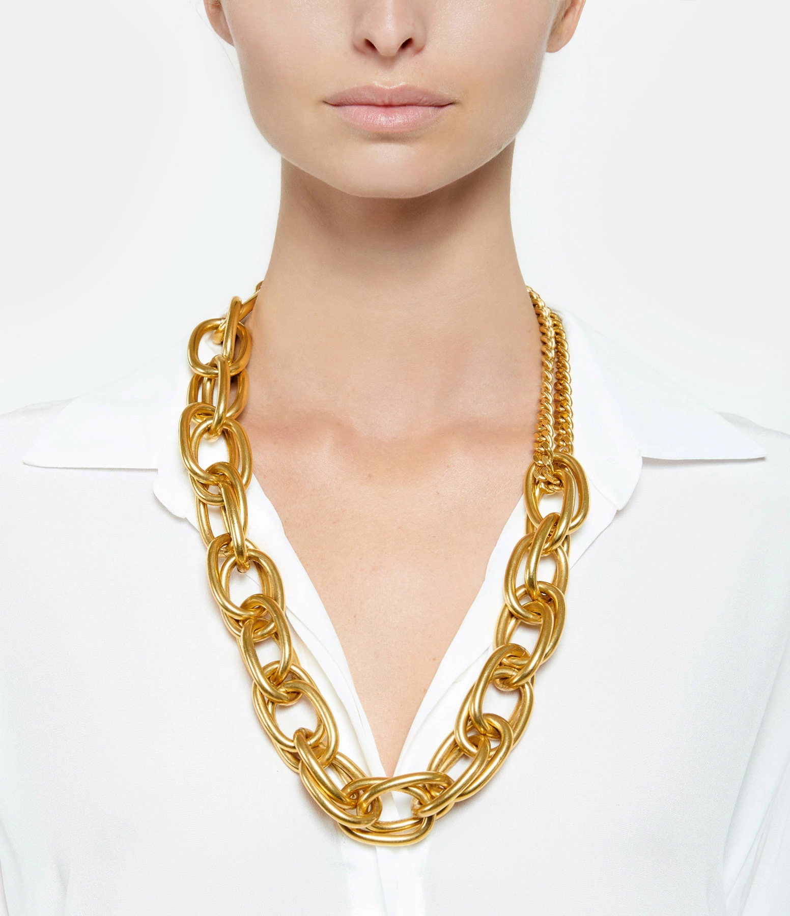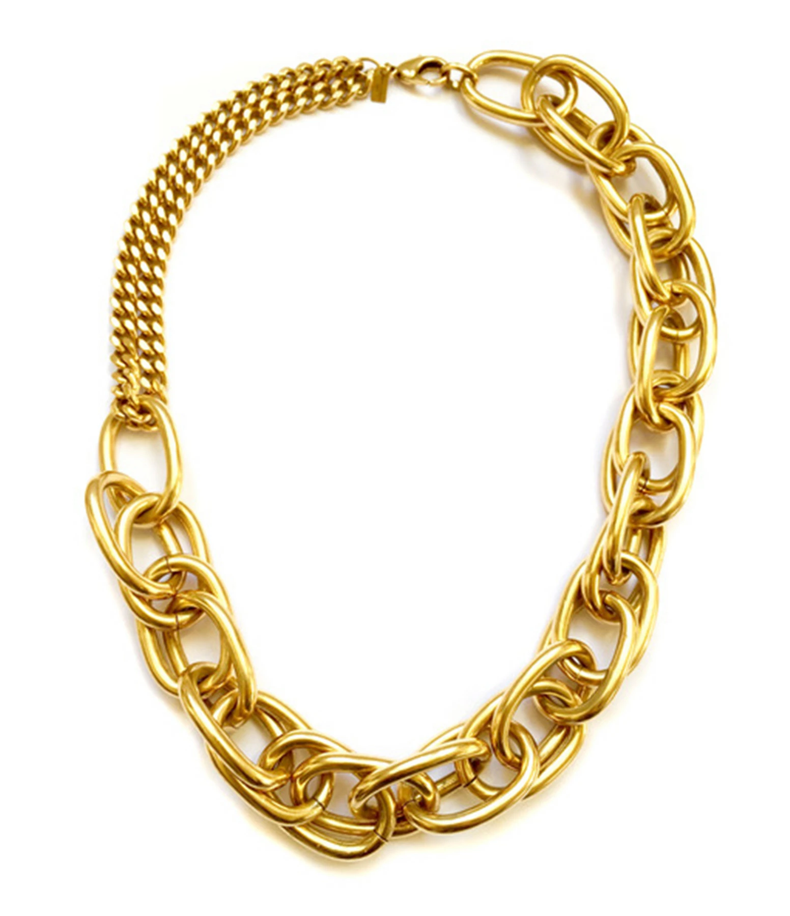 Collier long en laiton doré, deux chaînes fines et maillons imposants et entremêlés. Fermoir mousqueton.