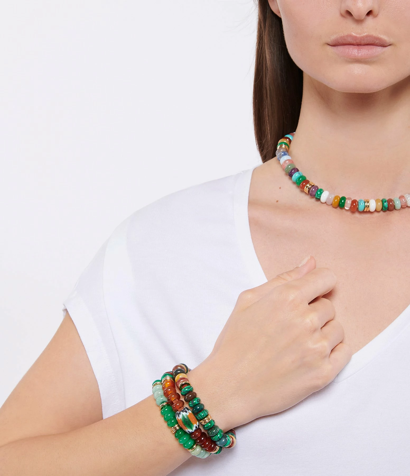Bracelet en perles sur cordon en daim avec fermoir ajustable en plaqué or, dans les tons oranges et verts.