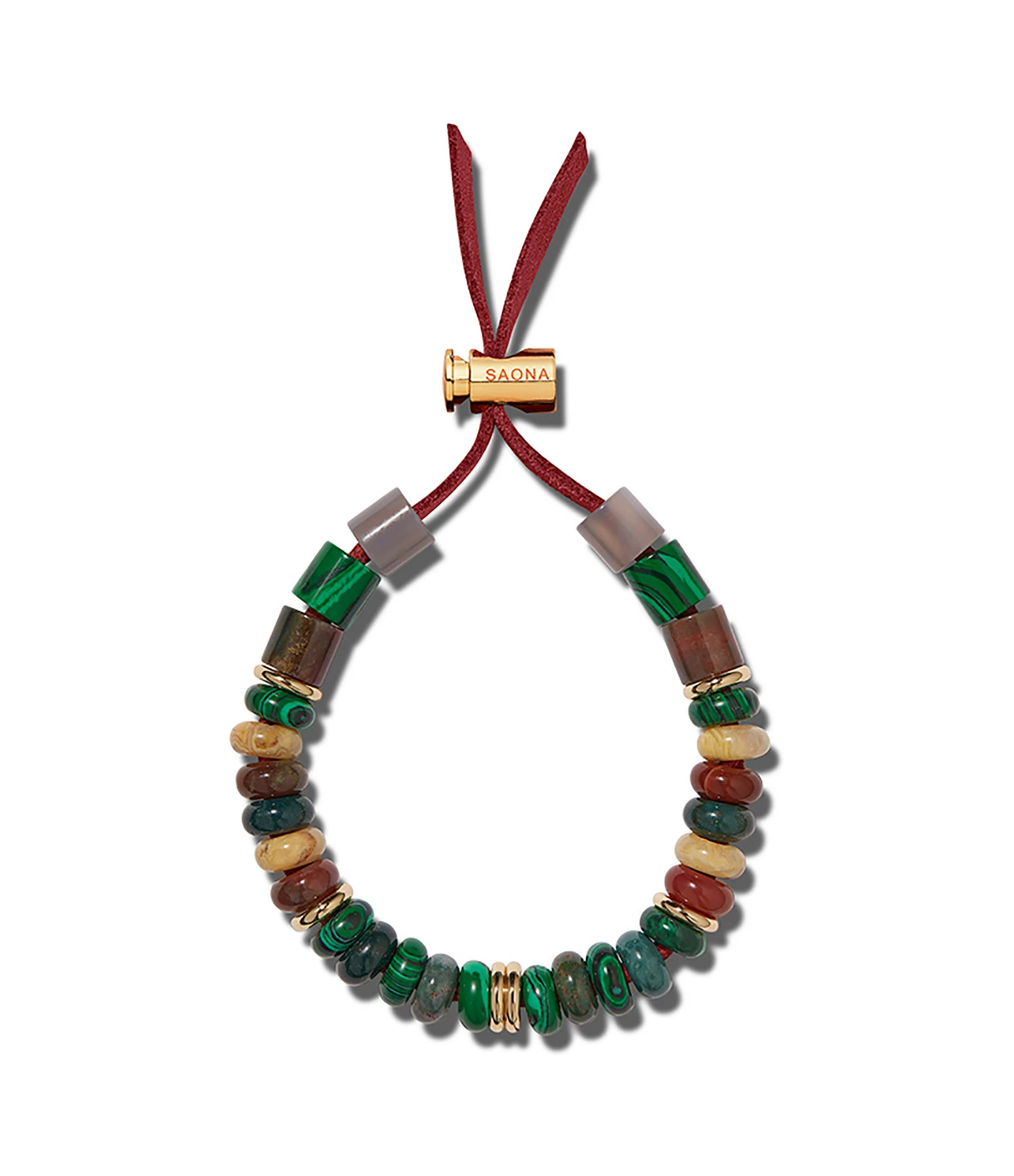 Bracelet en perles sur cordon en daim avec fermoir ajustable en plaqué or, dans les tons verts et marrons.