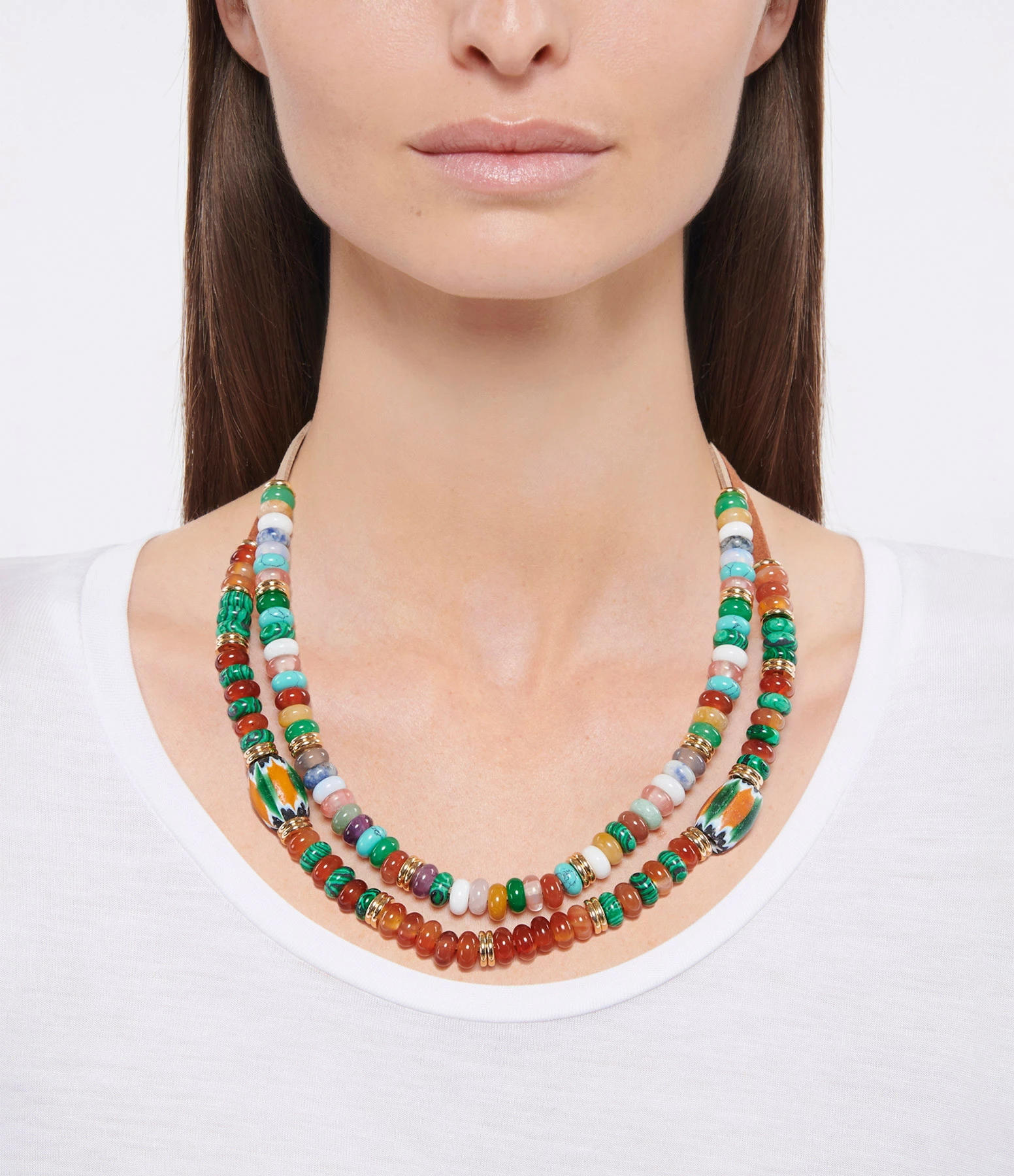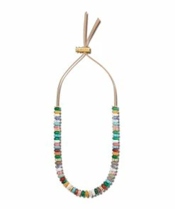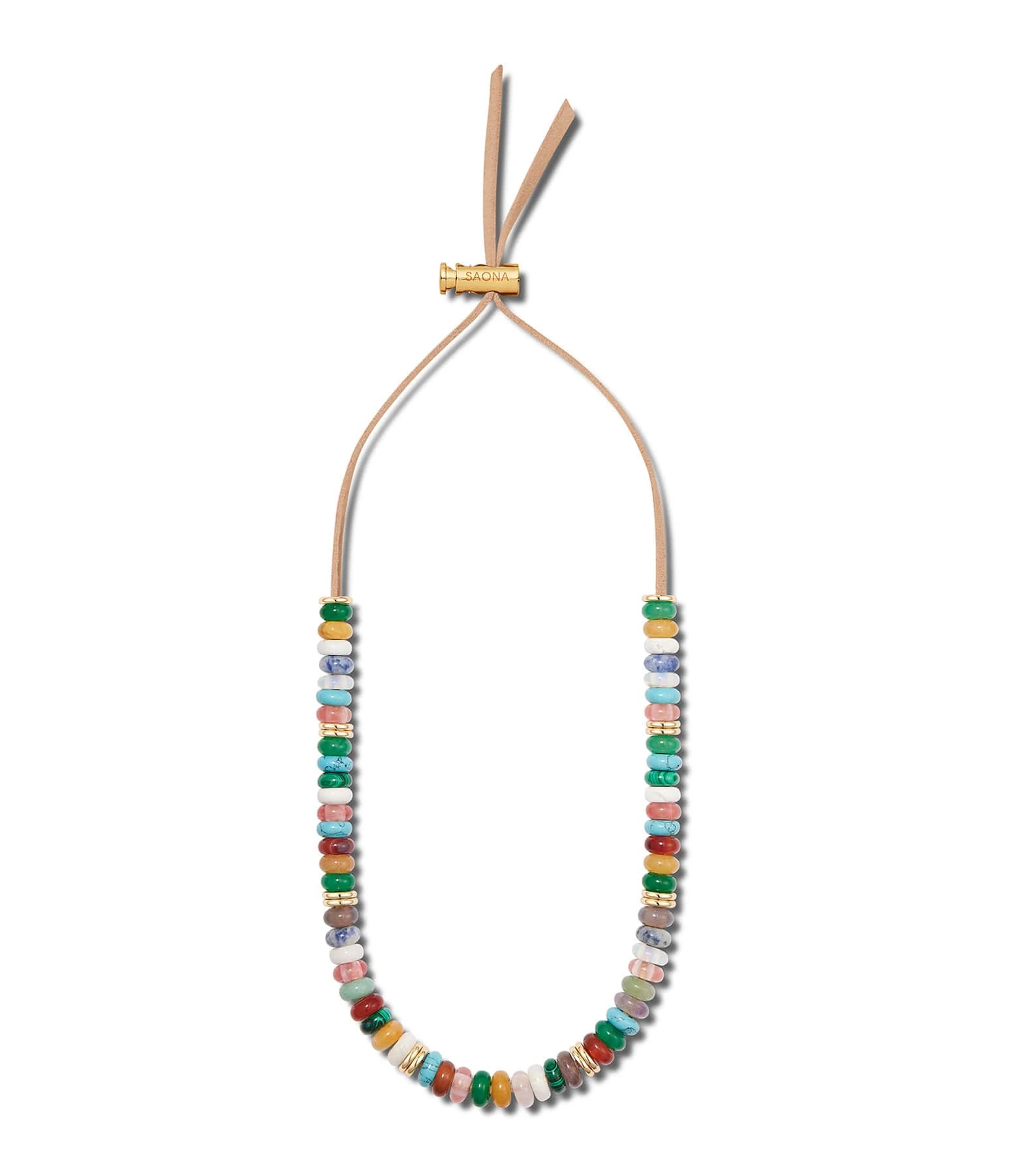 Collier en perles multicolores en daim avec fermoir ajustable en plaqué or.