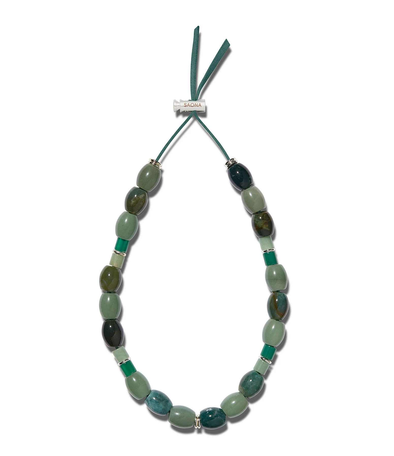 Collier en perles sur cordon en nubuck avec fermoir ajustable en plaqué or, dans les tons verts.