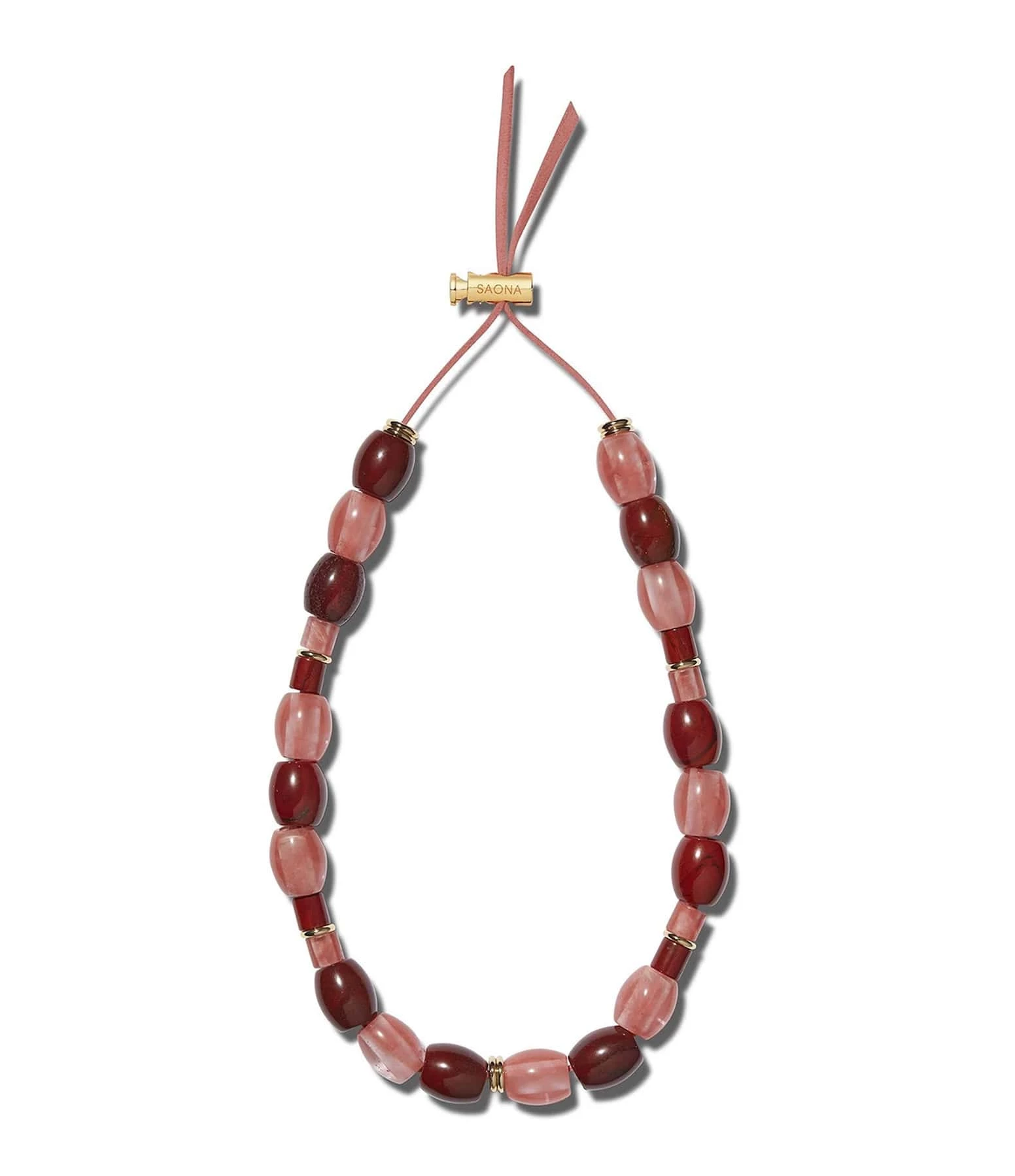 Collier en perles sur cordon en daim avec fermoir ajustable en plaqué or, dans les tons roses et rouges.