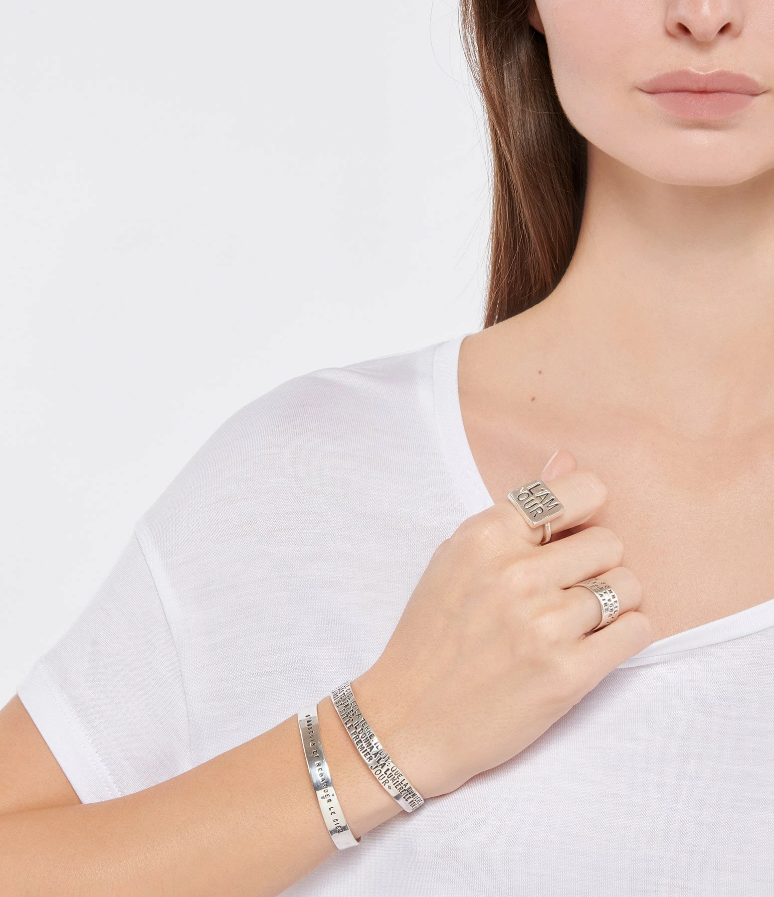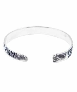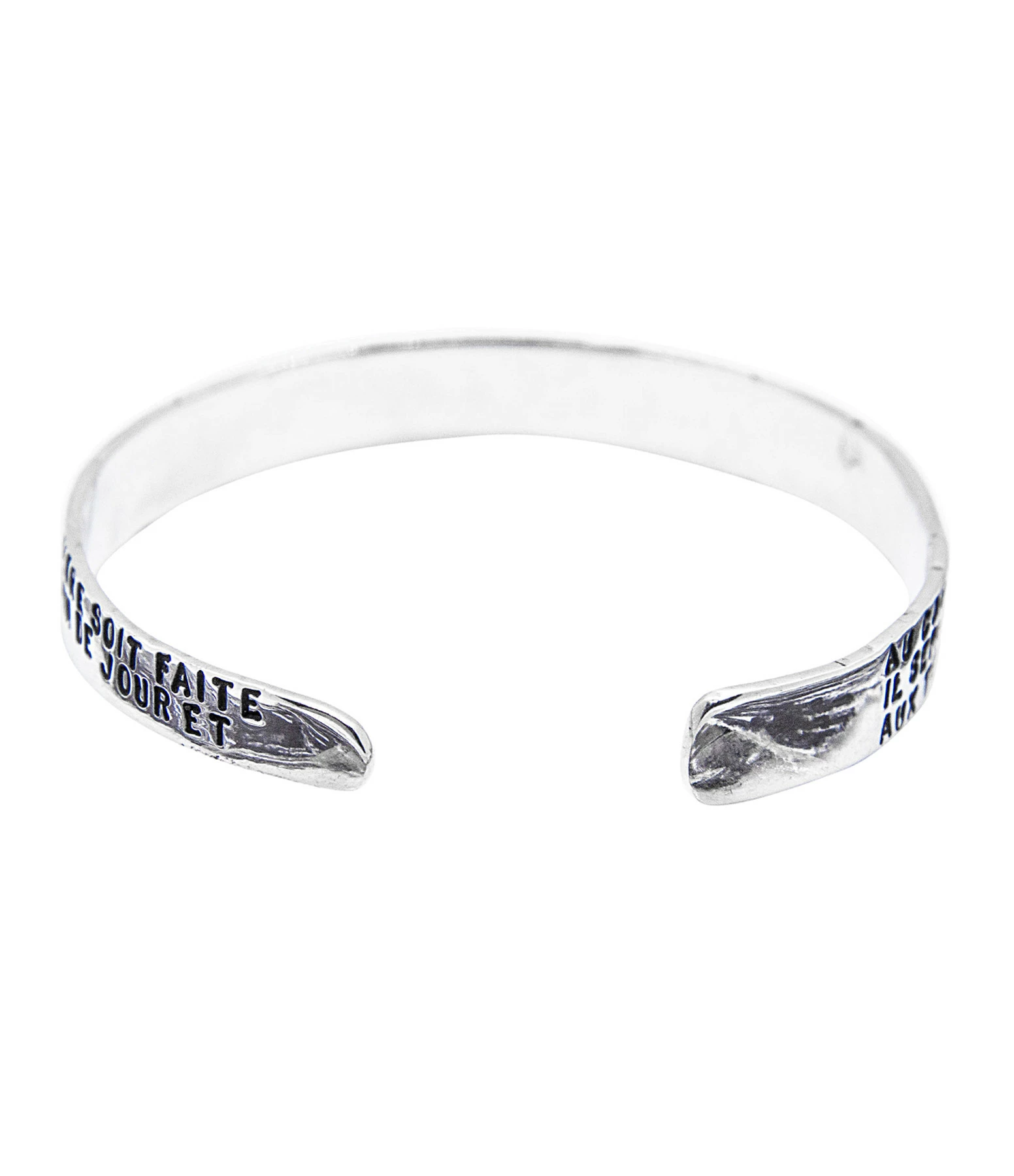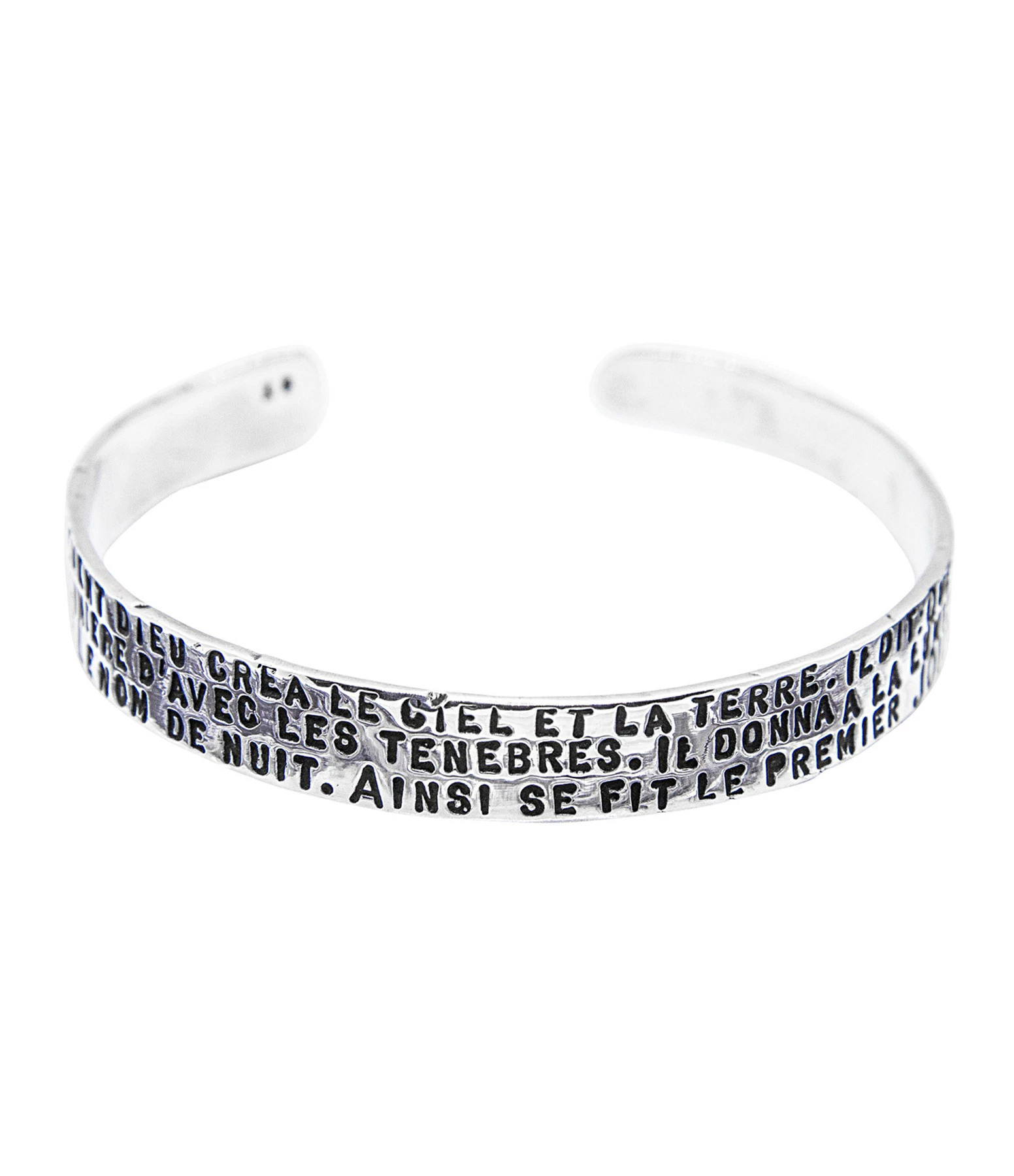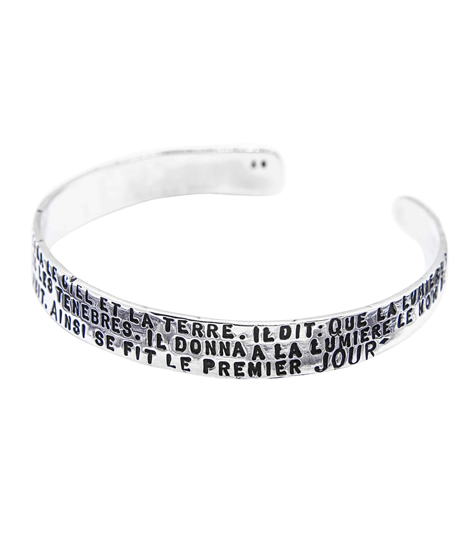 Bracelet jonc en argent avec gravure “Au commencement Dieu créa le ciel et la terre. Il dit : Que la lumière soit faite. Il sépara la lumière d’avec les ténèbres. Il donna à la lumière la nom de jour et aux ténèbres le nom de la nuit. Ainsi se fit le premier jour”.