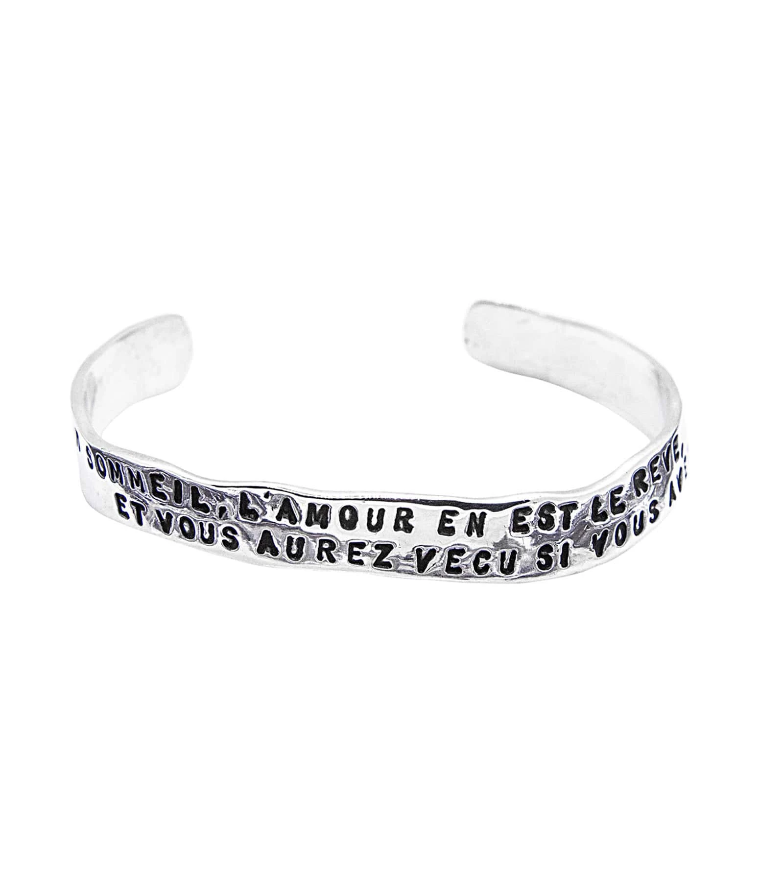 Bracelet jonc en argent avec gravure “La vie est un sommeil, l’amour en est le rêve, et vous aurez vécu si vous avez aimé”.