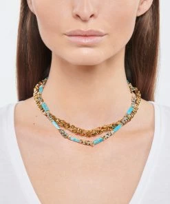 Bracelet en pierres naturelles turquoises et perles d’eau douce. Fermoir à cliquet ovale.