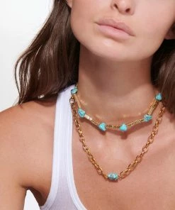 Collier en chaîne maille forçat. Pierre naturelle turquoise. Fermoir à cliquet ovale.