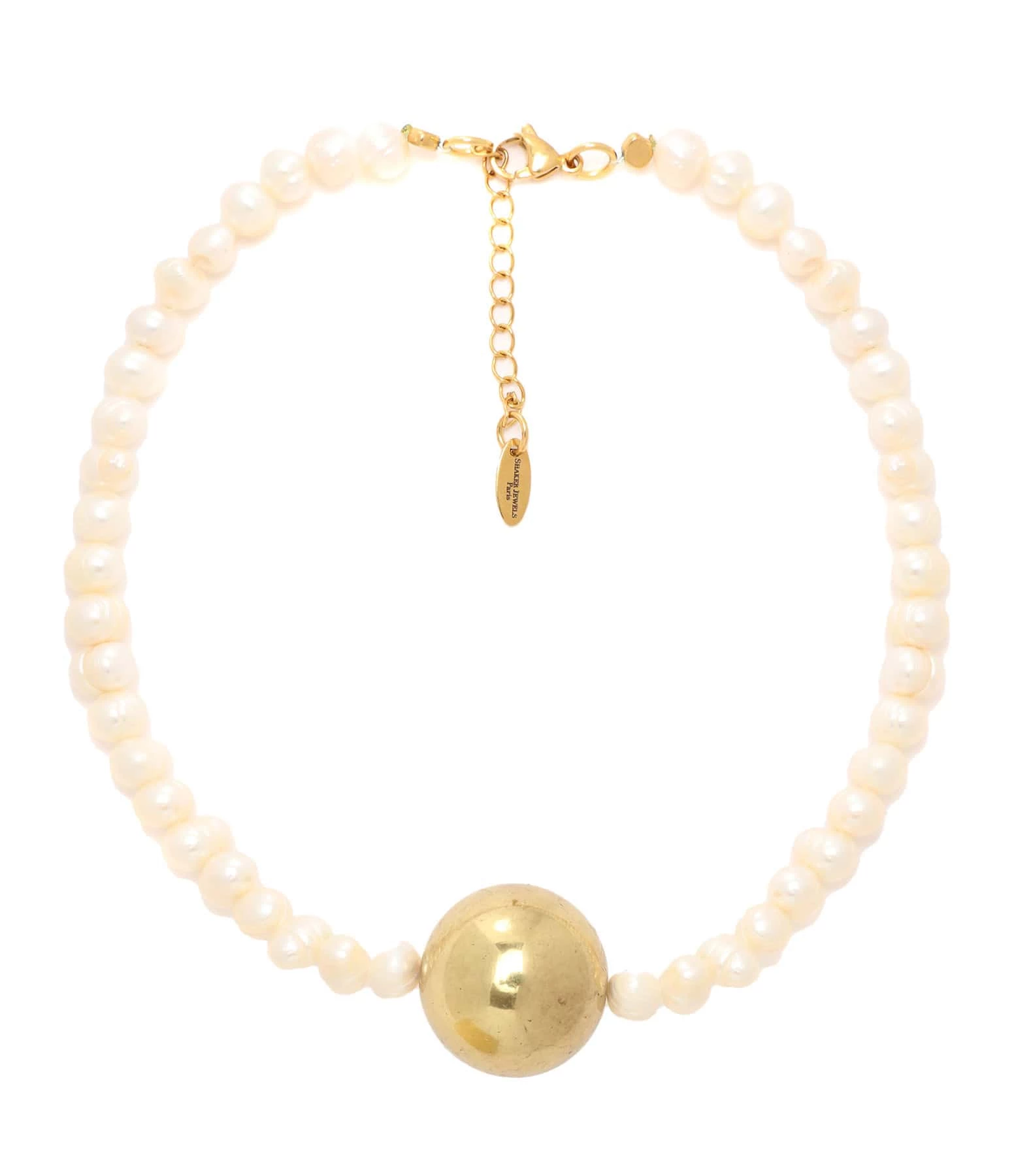 Collier en perles d’eau douce naturelles avec boule dorée. Fermoir à cliquet ovale.