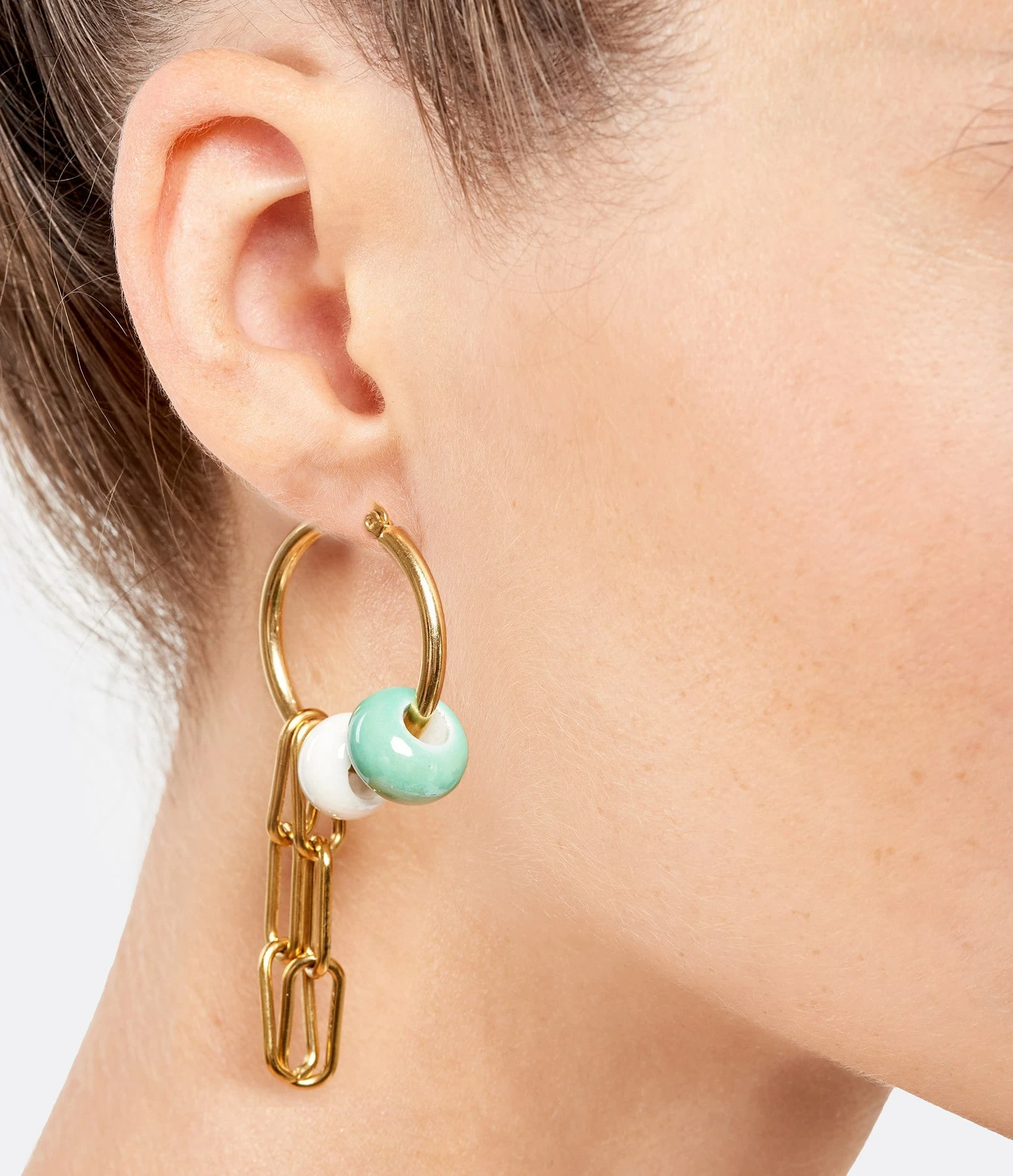Créoles en argent doré avec chaîne et perles de couleurs. Fermoir cliquet. Vendues à la paire.