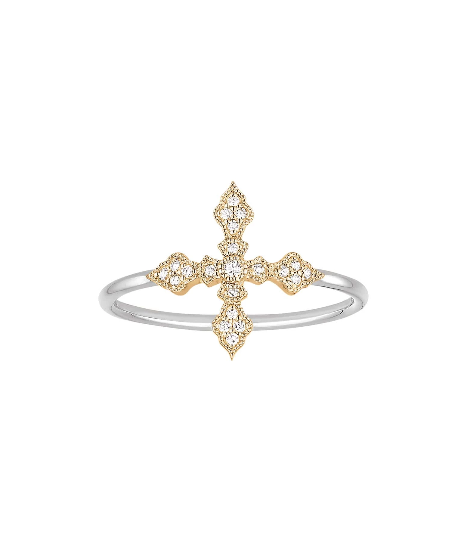 Bague en or blanc, jaune, rose ou noir avec croix sertie de 21 diamants blancs.