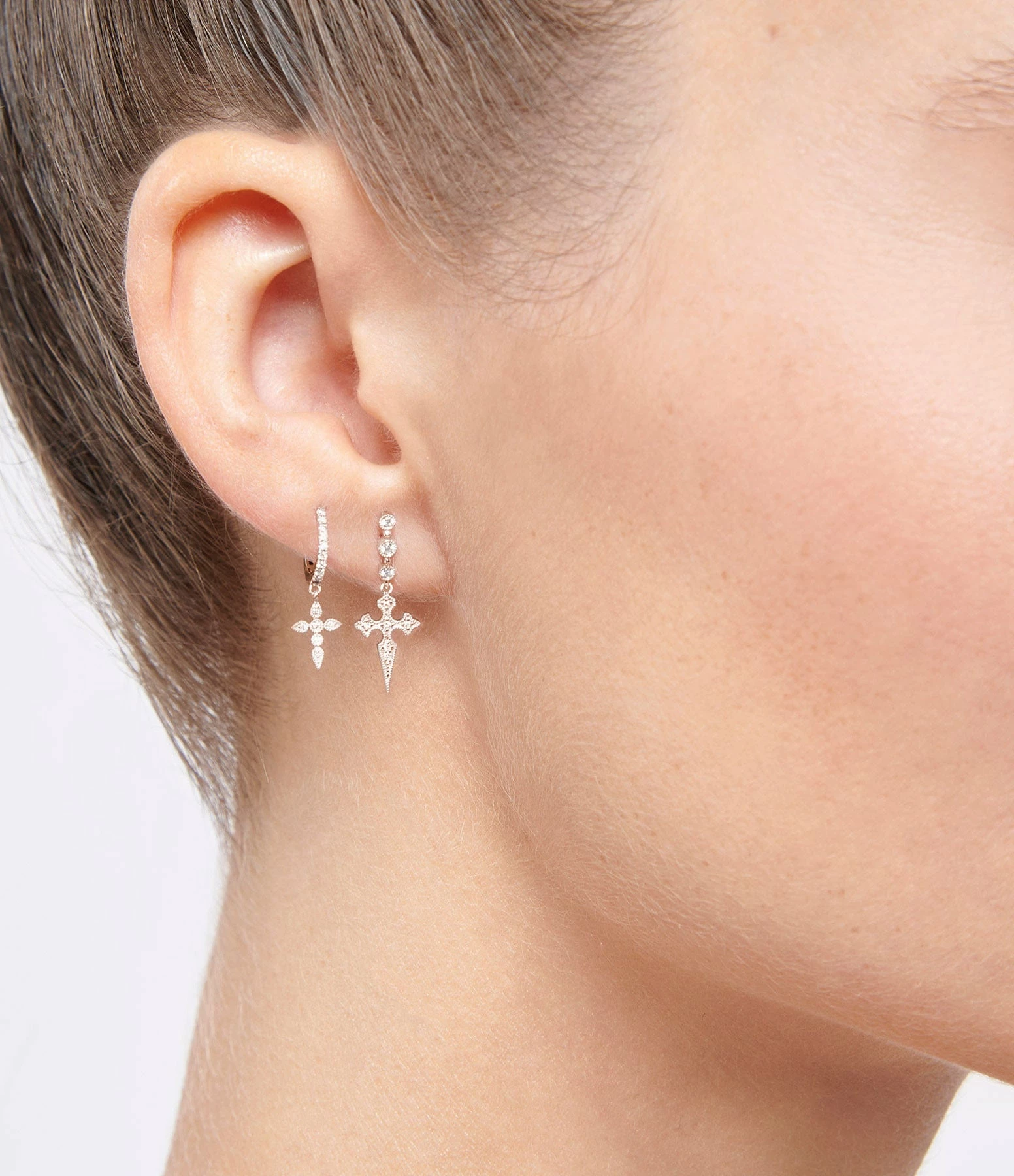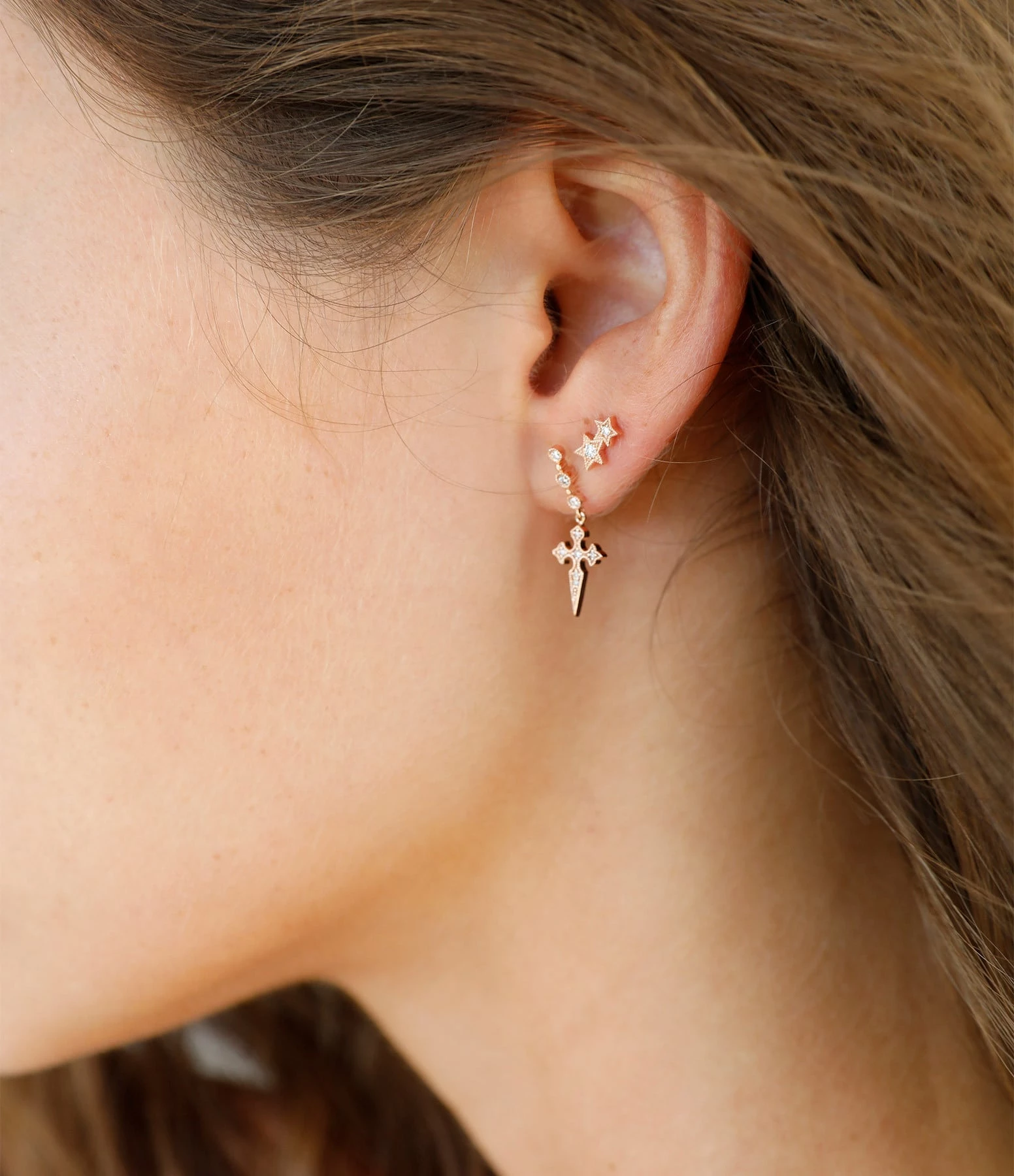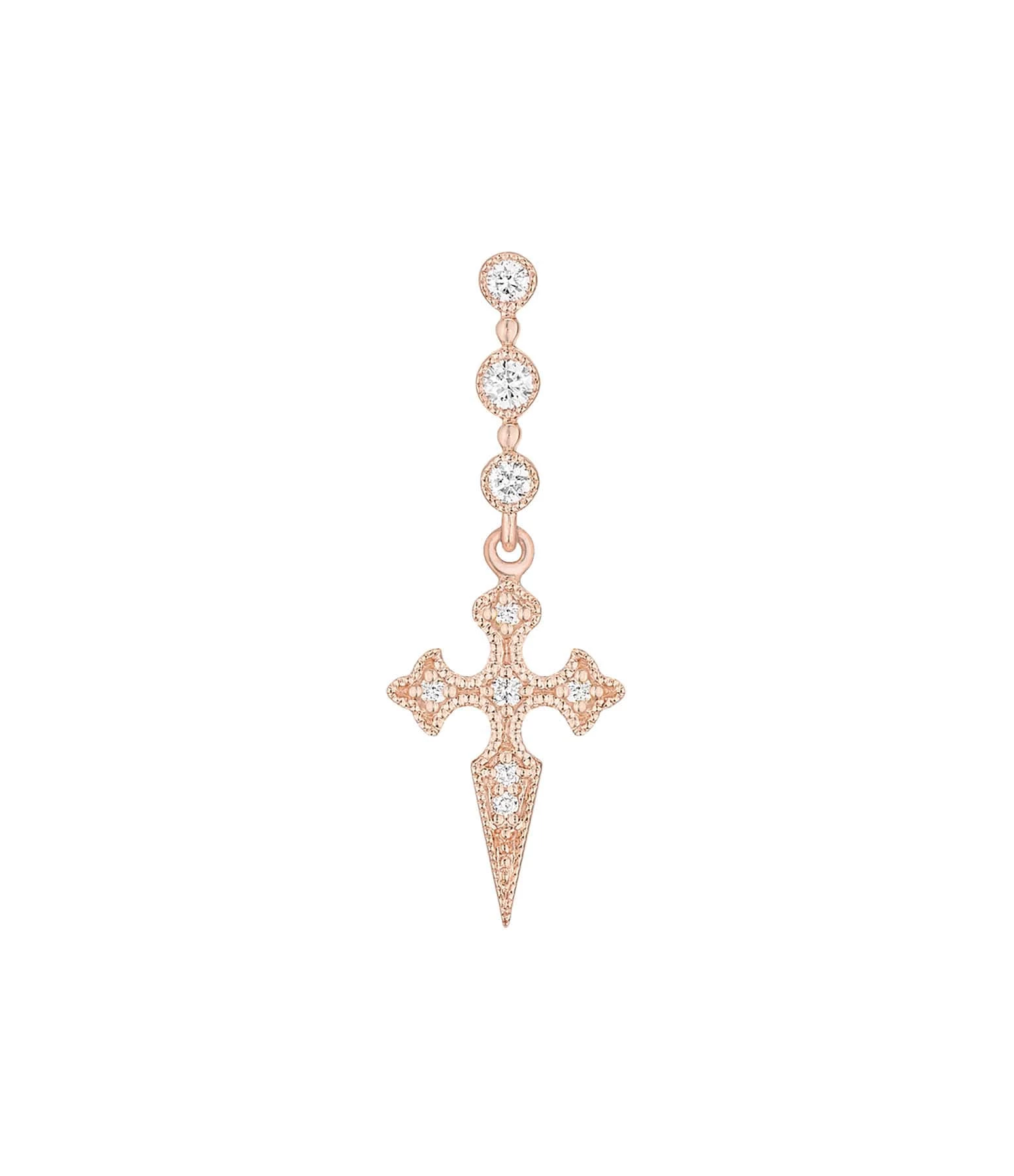 Boucle d’oreille or rose et diamants, croix inspirée du Moyen-Age. Fermoir sécurisé par système Alpa. Vendue à l’unité.