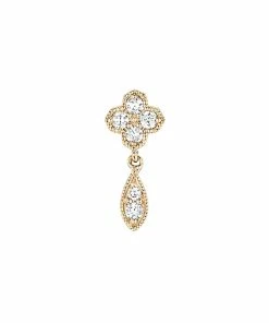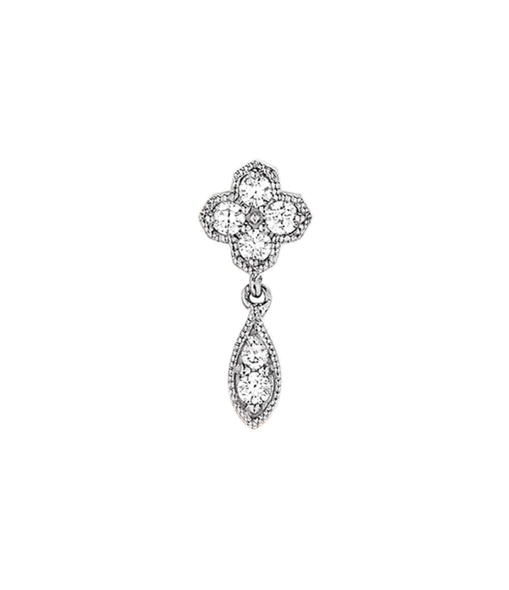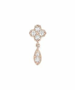 Boucle d’oreille en or jaune, blanc, rose ou noir. Fleur sertie de quatre diamants et une goutte sertie de deux diamants. Fermoir ALPA sécurisé.