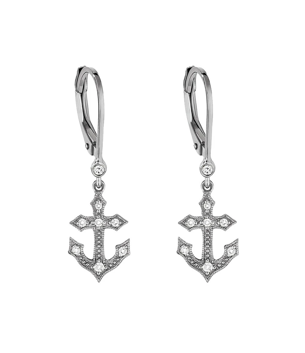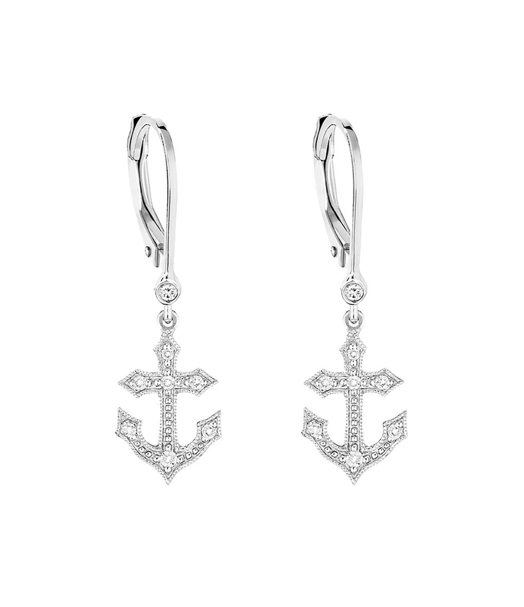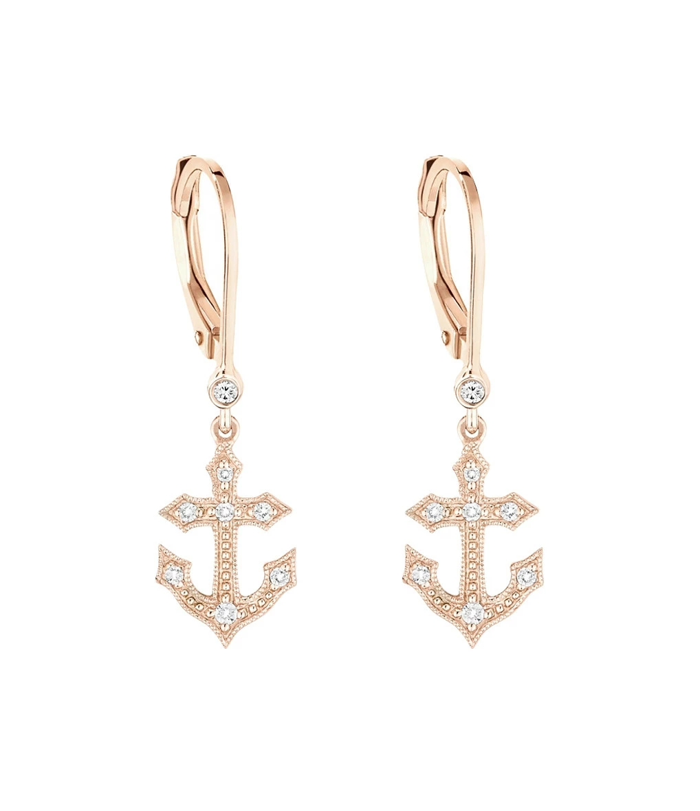 Boucles d’oreilles en or jaune, blanc, rose ou noir avec une ancre sertie de 16 diamants. Fermoirs dormeuses.
