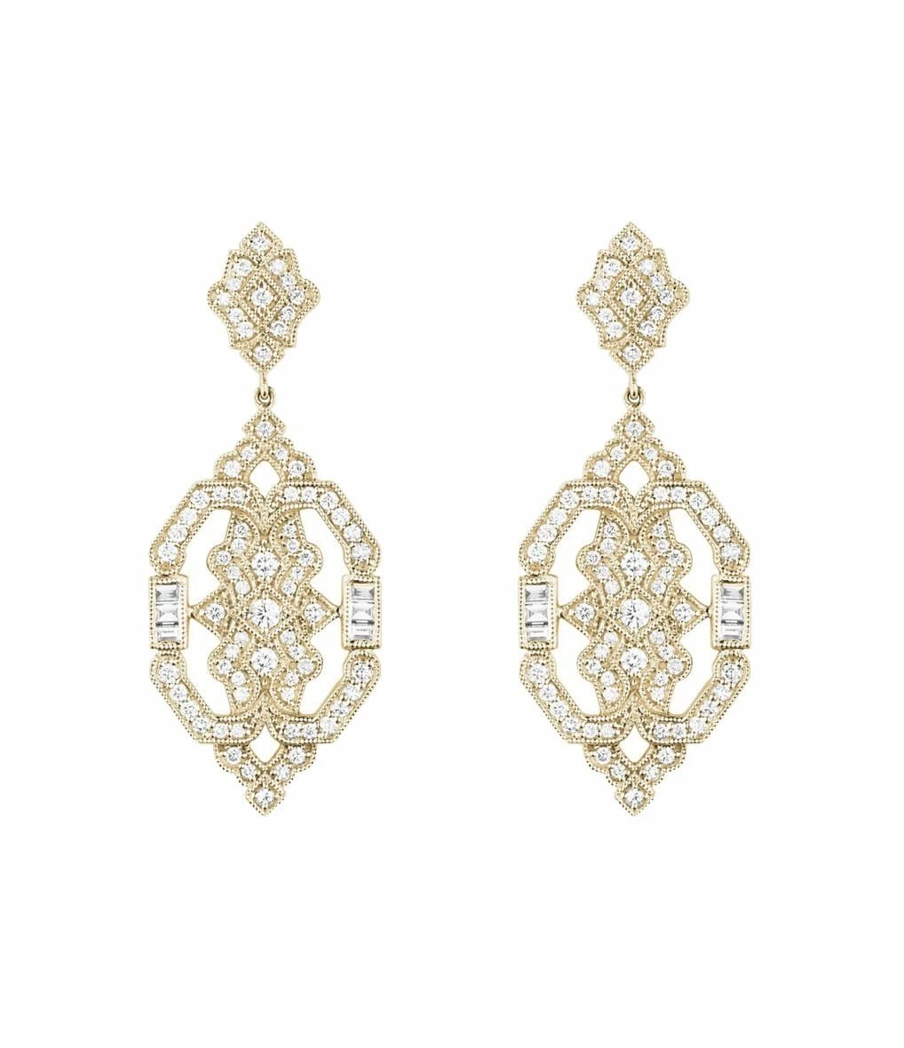 Boucles d’oreilles pendantes en or jaune, rose, noir ou blanc, serties de 78 diamants. Fermoirs ALPA sécurisés.