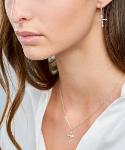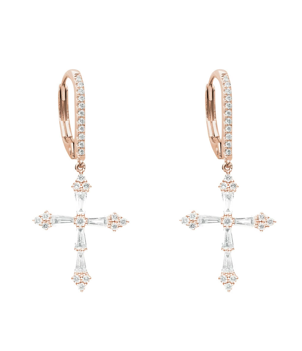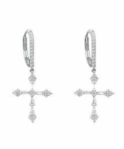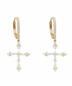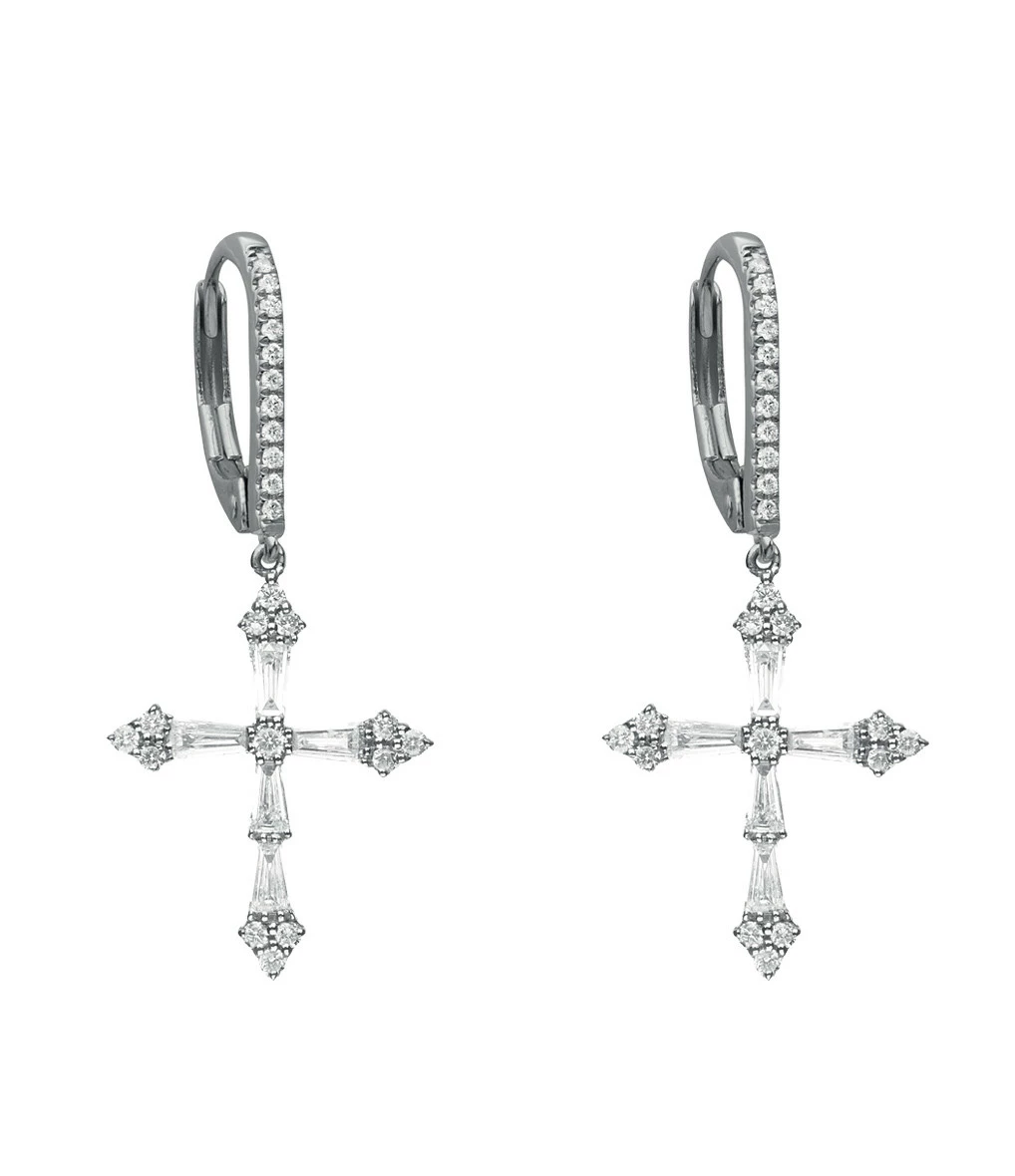 Boucles d’oreilles dormeuses composées d’une croix en or blanc, or jaune, or rose ou or noir serties de 54 diamants blancs. Fermoirs crochets.
