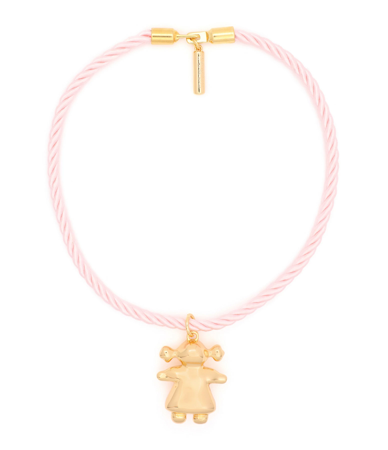 Collier sur cordon en satin rose avec un pendentif “petite fille” doré. Fermoir à crochet.