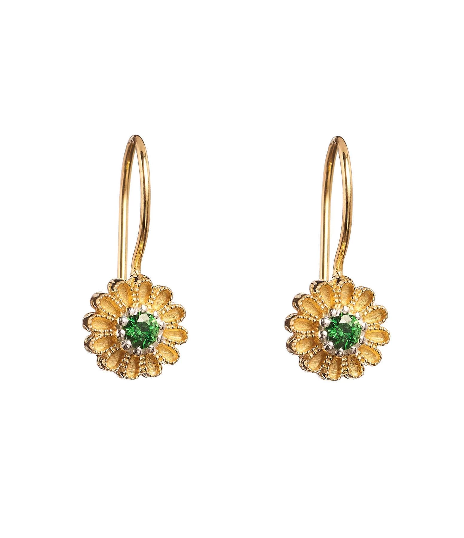 Boucle d’oreille amulette en plaqué or ornée d’une fleur en zircon vert. Fermoir crochet.