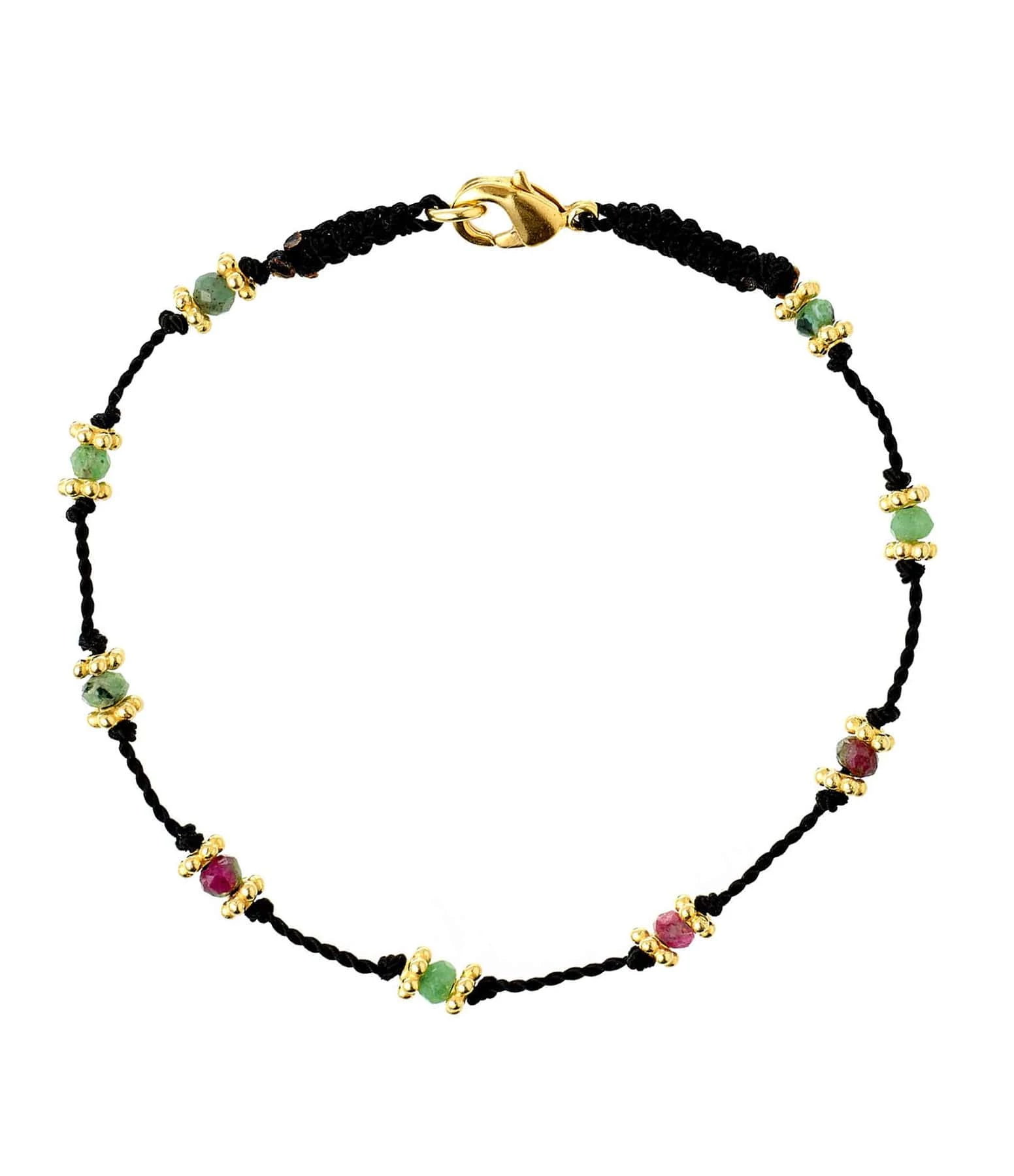 Bracelet en cordon orné de perles de Rubis-zoïsite et de perles plaquées or. Fermoir classique à ressort.