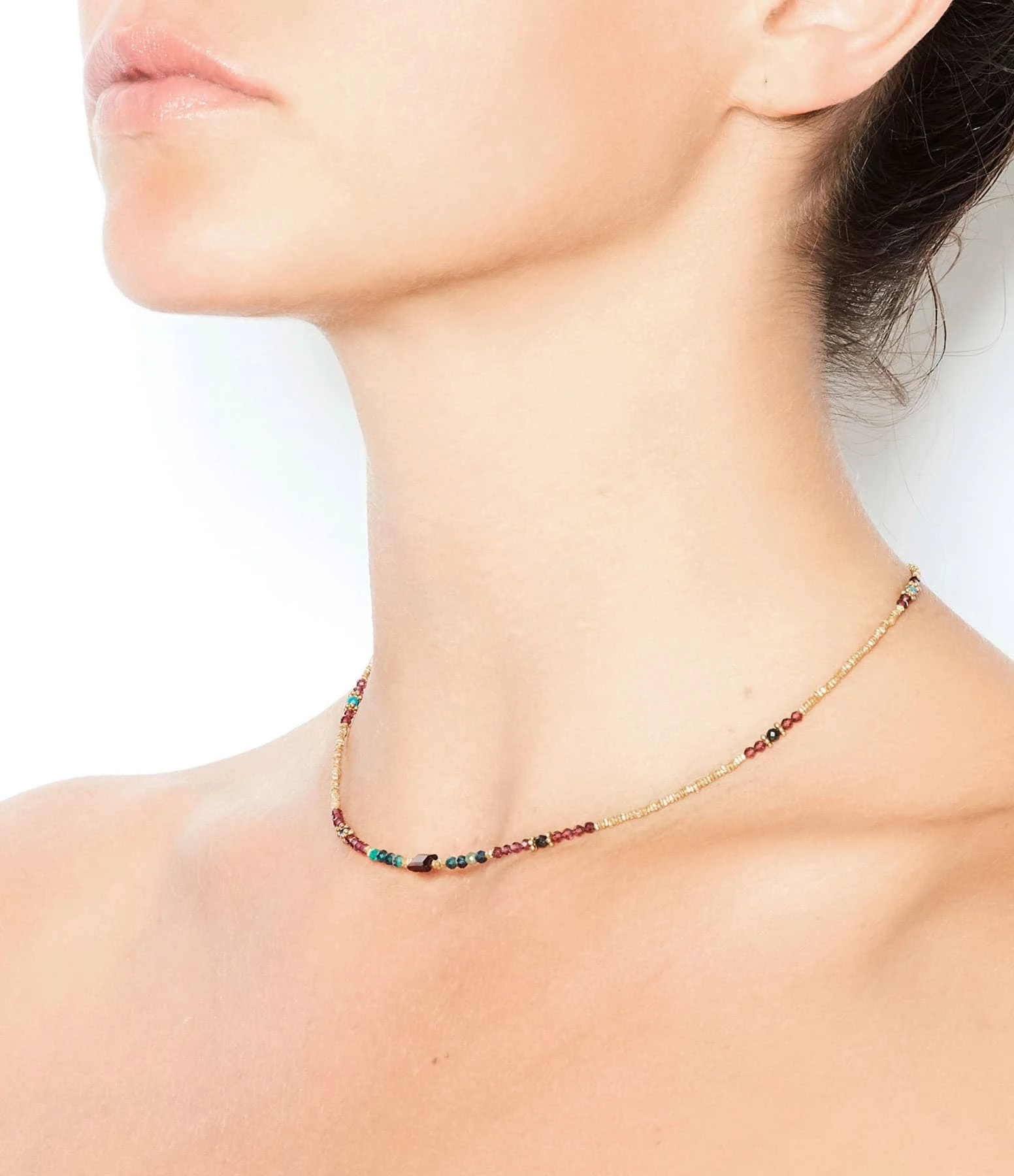 Conseil stylistique : Le collier Meghna veut symboliser par ses pierre, la vision de l’Inde par un mélange de couleurs et de formes.