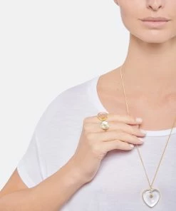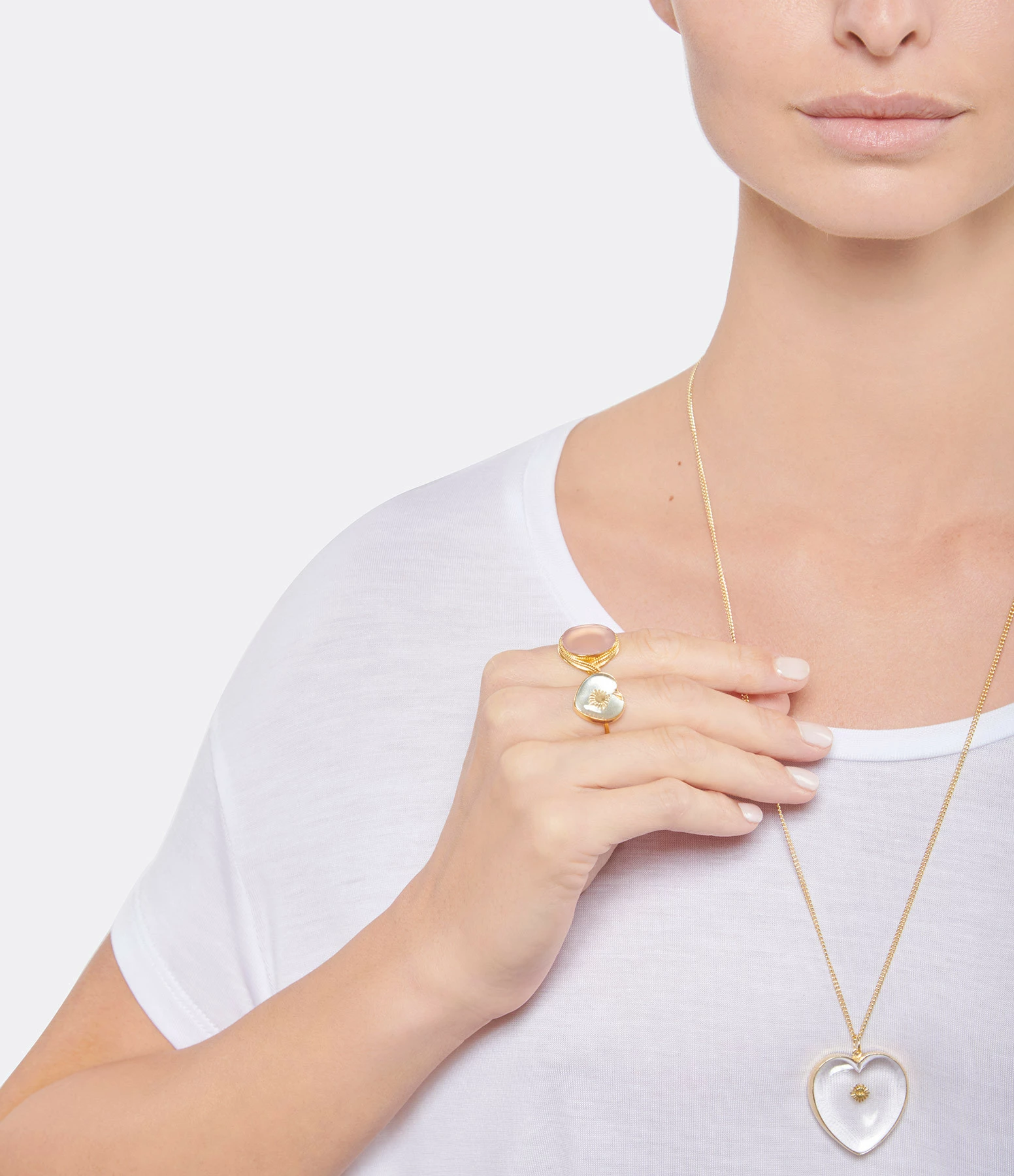 Bague en argent massif doré avec une pierre cœur en cristal et petit soleil plaqué or au centre.