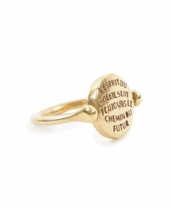 Bague en argent doré, plaque articulée avec soleil d’un côté et inscription “L’esprit du soleil suit toujours le chemin du futur” de l’autre, à porter du côté de votre choix selon vos humeurs.